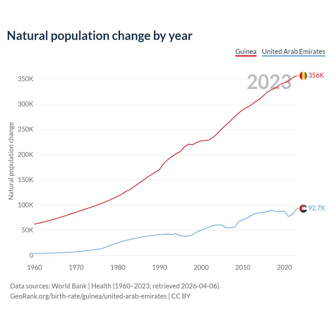 Guinea has an annual birth rate of 33.8 births per 1,000 people, compared to 9.77 for the United Arab Emirates. The average number of children a woman is expected to have during her lifetime — the fertility rate, is 4.22 in Guinea and 1.2 in the United Arab Emirates — 71.5% difference.