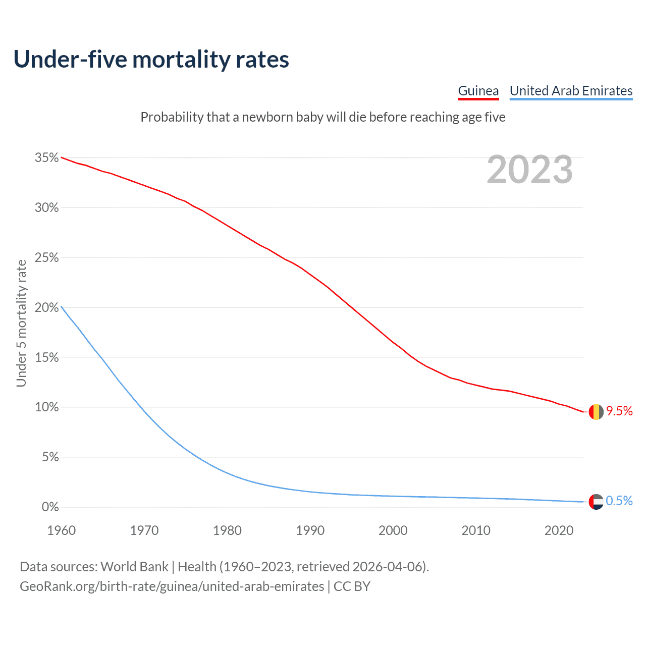The chance that a newborn baby will die before reaching age five is 9.5% in Guinea and 0.5% in the United Arab Emirates. Above is a chart with historical data on under-five mortality rates.