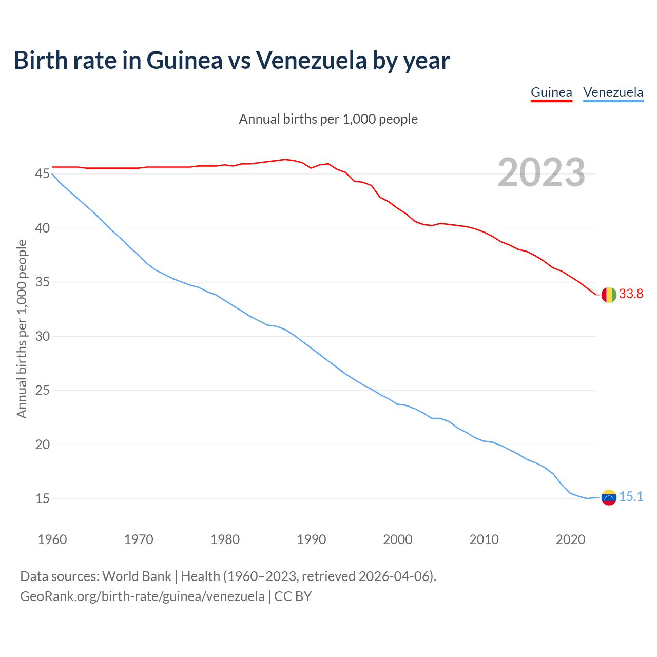 Guinea has an annual birth rate of 33.8 births per 1,000 people, compared to 15.1 for Venezuela. The average number of children a woman is expected to have during her lifetime — the fertility rate, is 4.22 in Guinea and 2.08 in Venezuela — 50.7% difference.