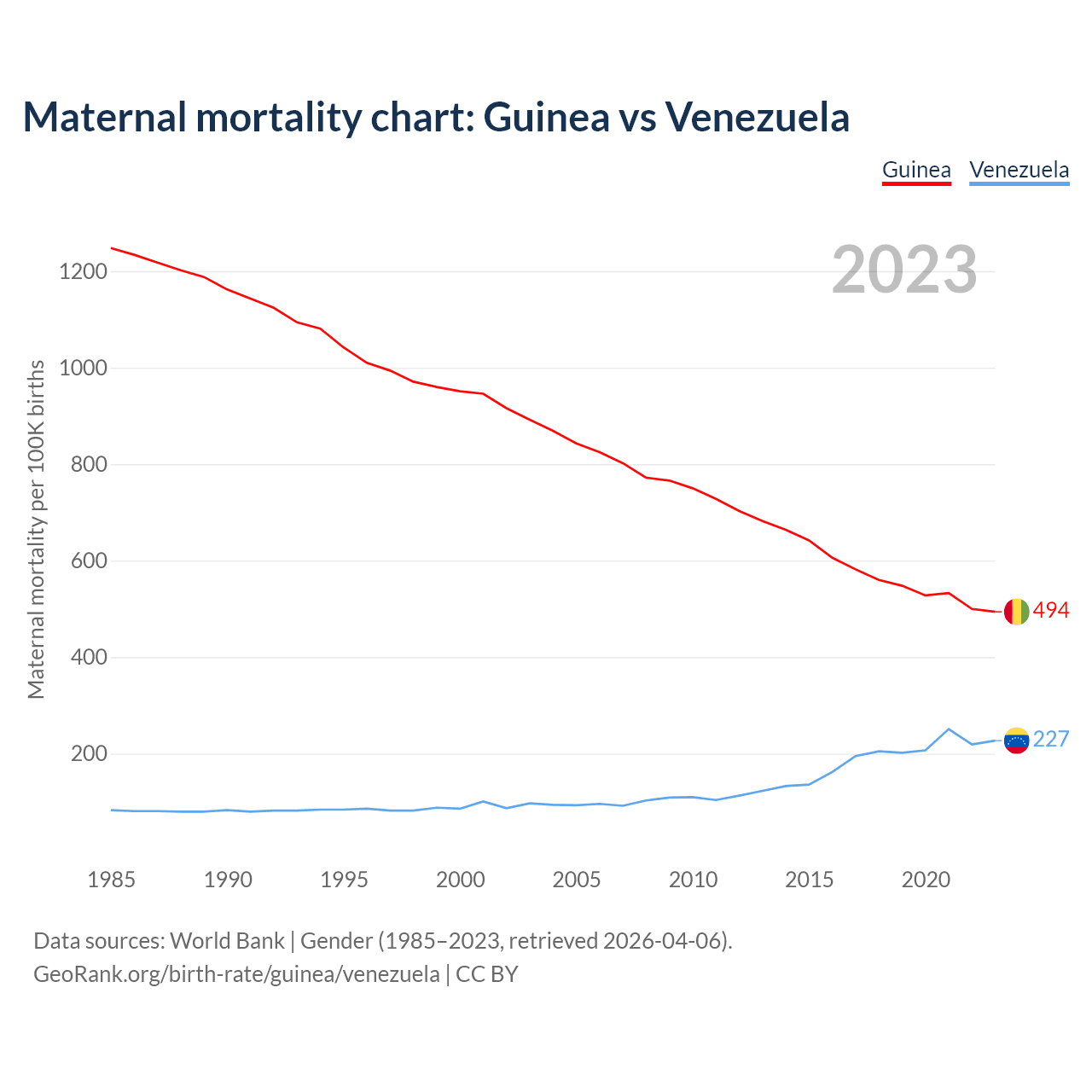 The maternal mortality rate, which is the probability of dying during childbirth or within 42 days of pregnancy termination, is 494 deaths per 100,000 live births in Guinea, compared to 227 deaths in Venezuela.