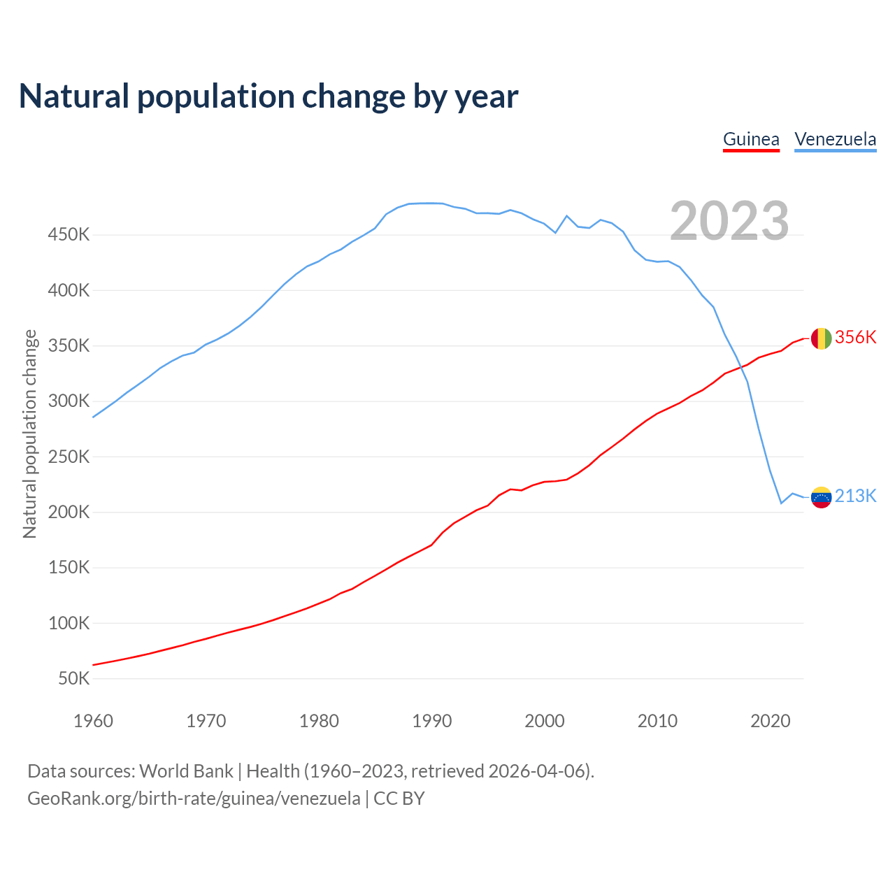 According to the latest available data on birth rates, the fertility rate in Guinea was 4.22 children per woman in 2023, compared to 2.08 in Venezuela in 2023. The replacement level is considered to be 2.1 children per woman.