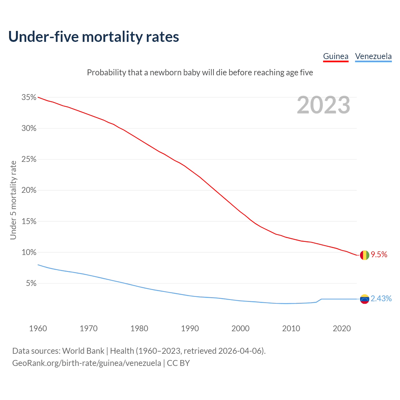 The chance that a newborn baby will die before reaching age five is 9.5% in Guinea and 2.43% in Venezuela. Above is a chart with historical data on under-five mortality rates.