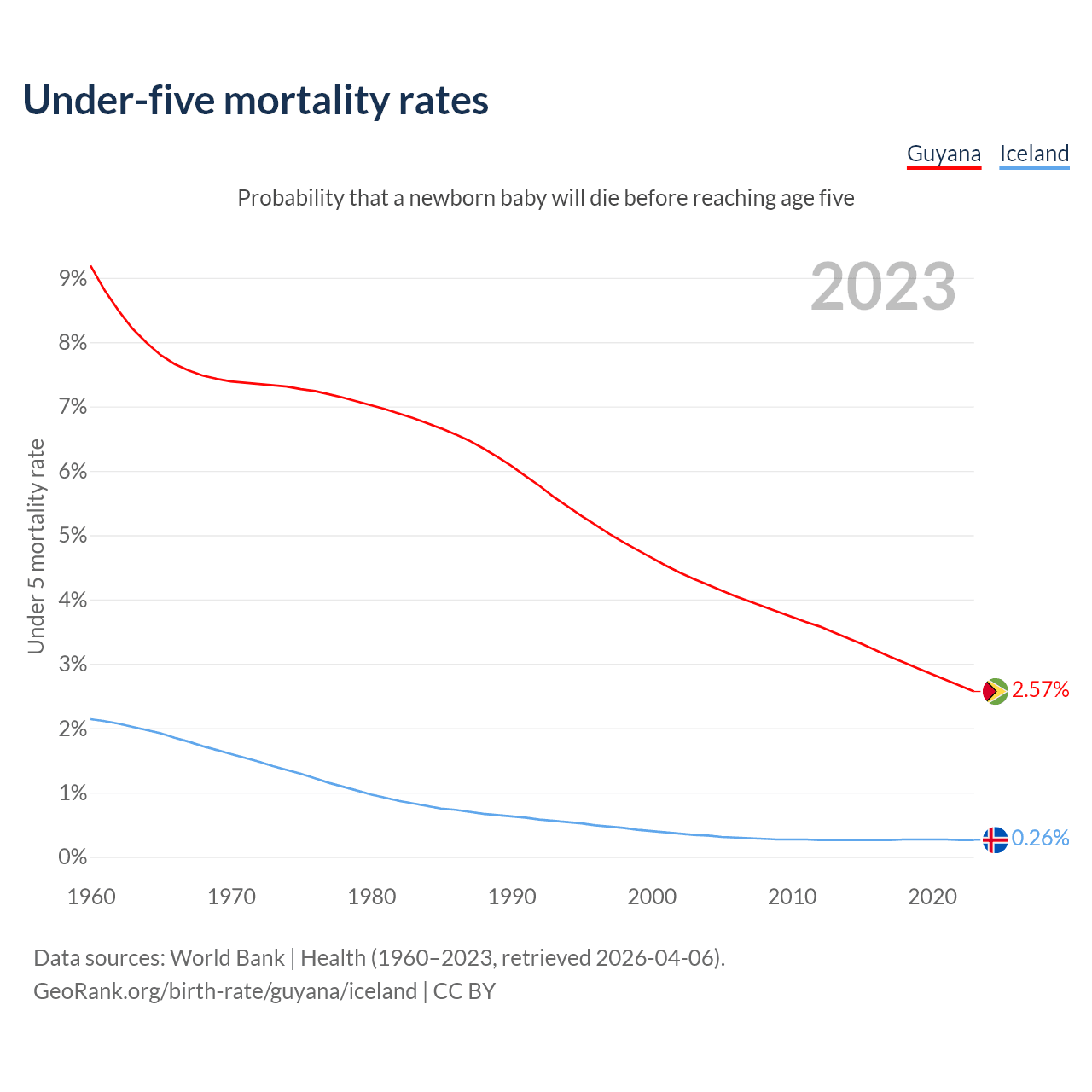 The chance that a newborn baby will die before reaching age five is 2.57% in Guyana and 0.26% in Iceland. Above is a chart with historical data on under-five mortality rates.