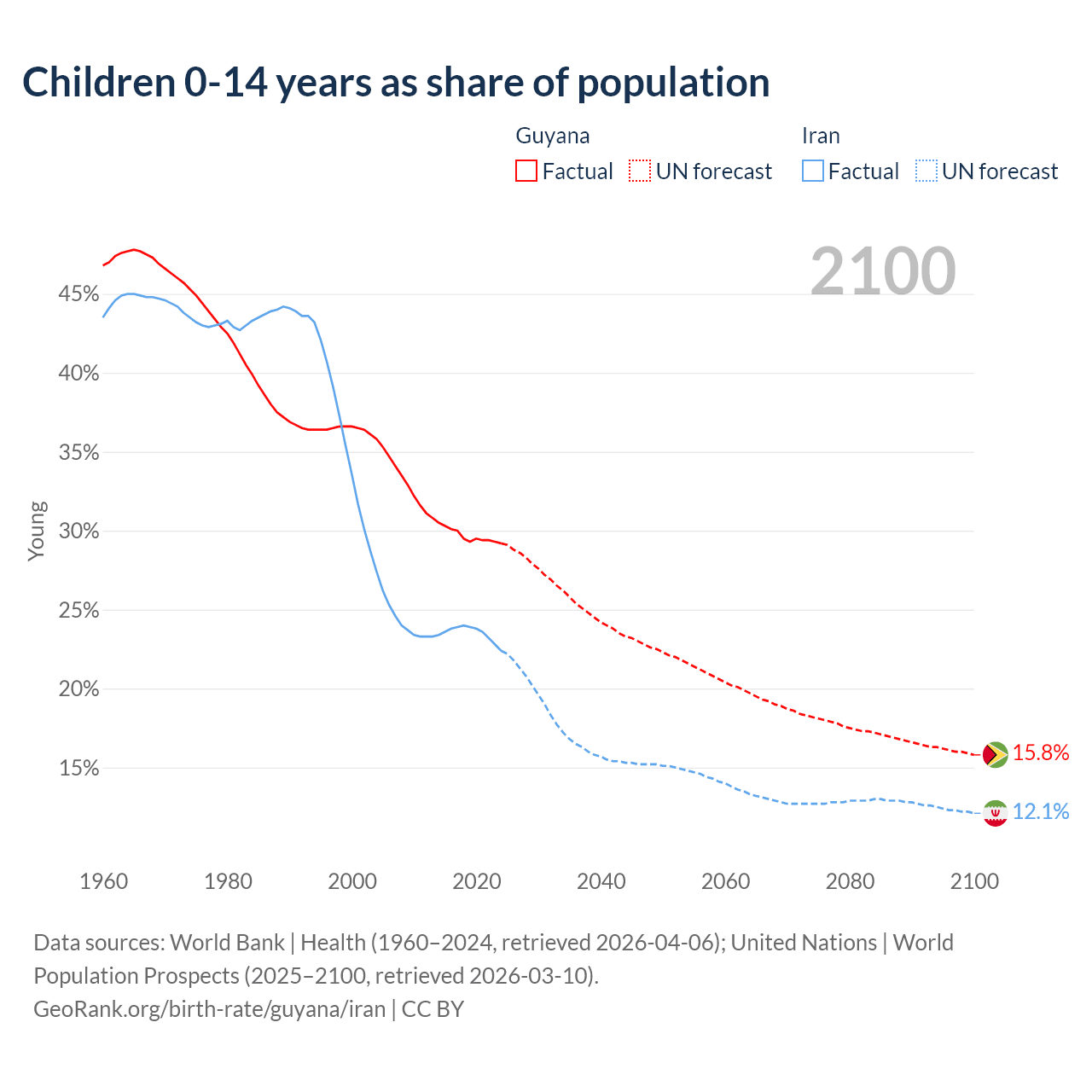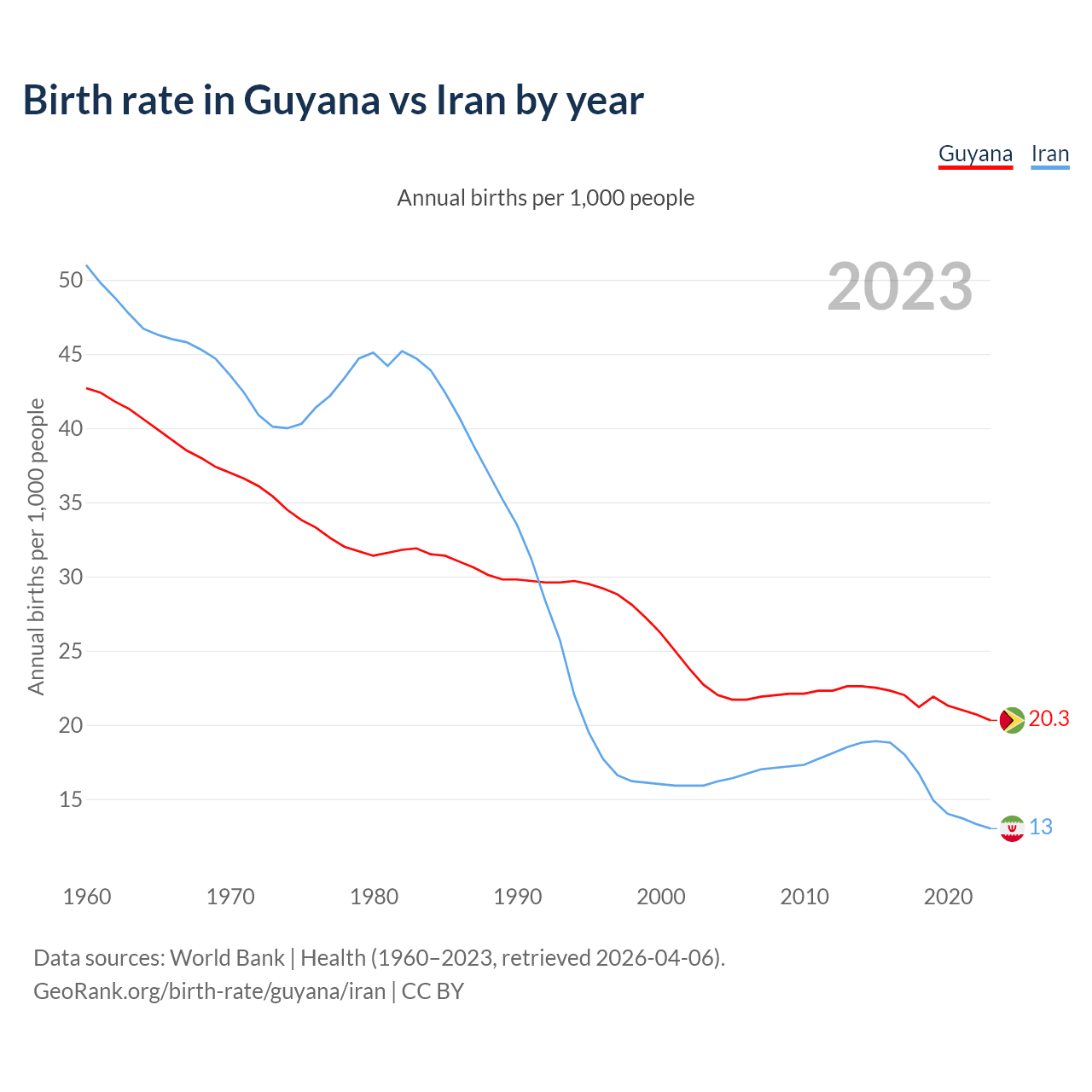 According to the latest available data on birth rates, the fertility rate in Guyana was 2.41 children per woman in 2023, compared to 1.7 in Iran in 2023. The replacement level is considered to be 2.1 children per woman.