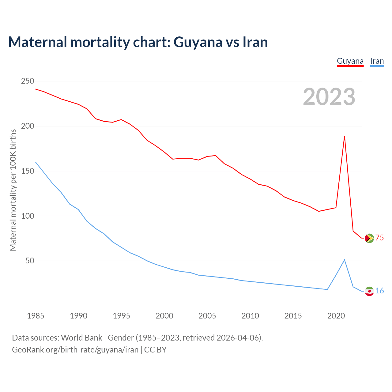 The maternal mortality rate, which is the probability of dying during childbirth or within 42 days of pregnancy termination, is 75 deaths per 100,000 live births in Guyana, compared to 16 deaths in Iran.
