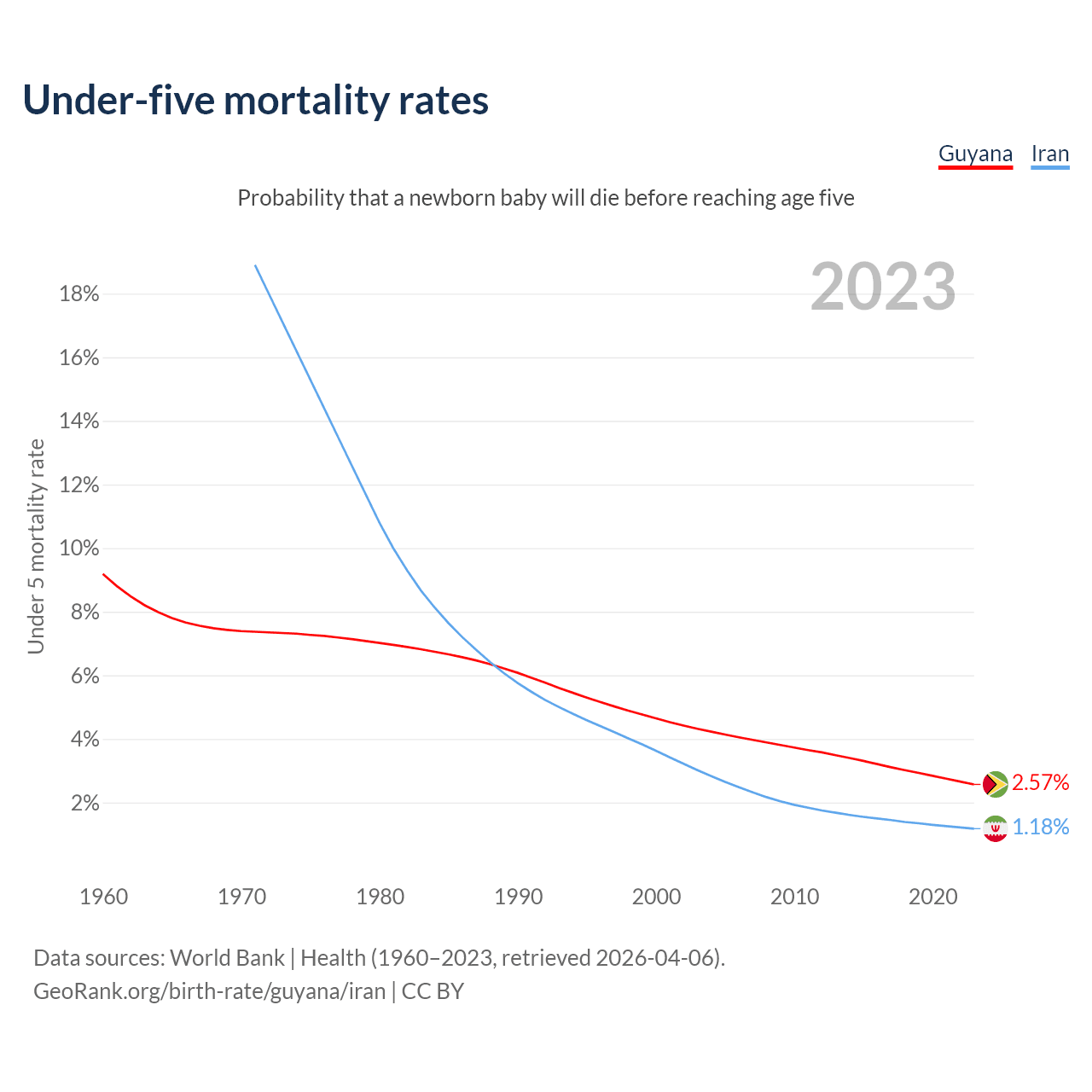 The chance that a newborn baby will die before reaching age five is 2.57% in Guyana and 1.18% in Iran. Above is a chart with historical data on under-five mortality rates.