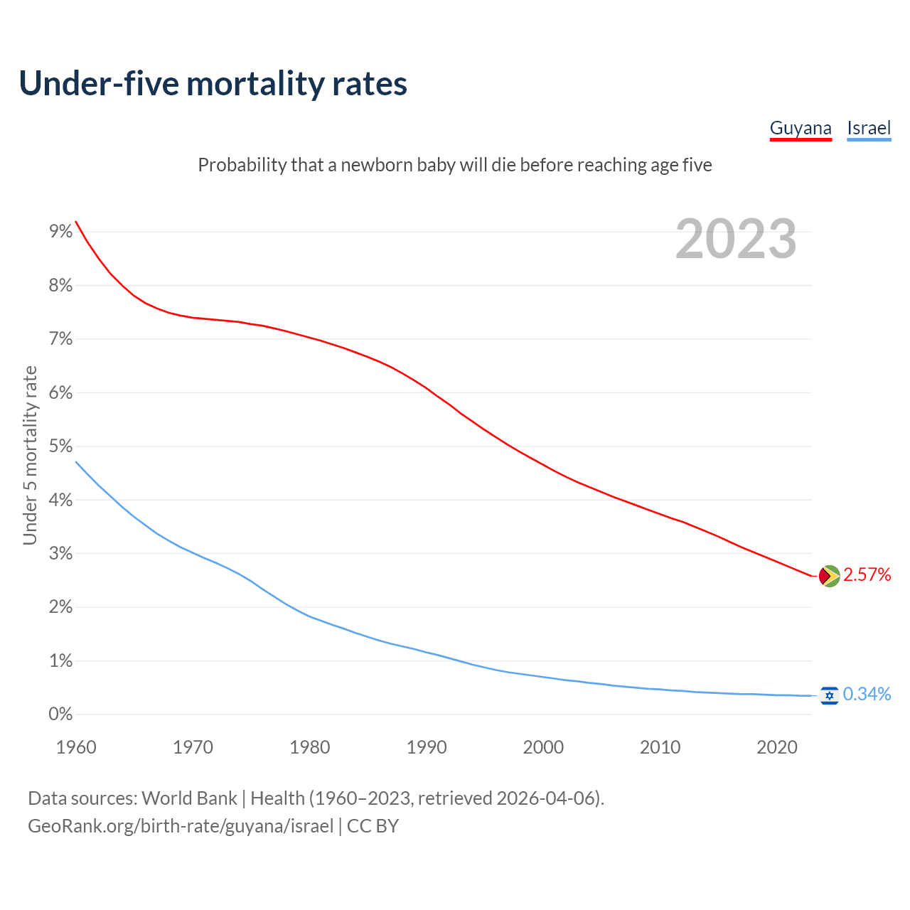 The chance that a newborn baby will die before reaching age five is 2.57% in Guyana and 0.34% in Israel. Above is a chart with historical data on under-five mortality rates.