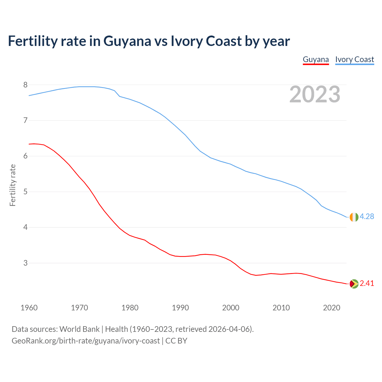 According to the latest available data on birth rates, the fertility rate in Guyana was 2.41 children per woman in 2023, compared to 4.28 in Ivory Coast in 2023. The replacement level is considered to be 2.1 children per woman.