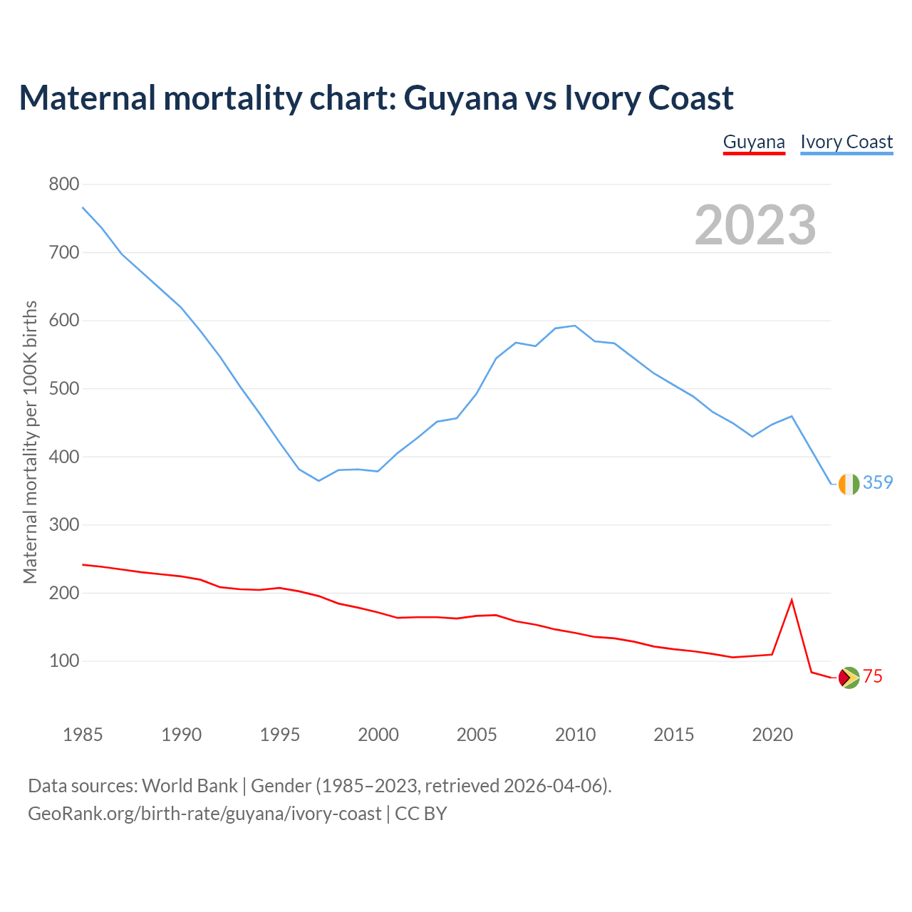 The maternal mortality rate, which is the probability of dying during childbirth or within 42 days of pregnancy termination, is 75 deaths per 100,000 live births in Guyana, compared to 359 deaths in Ivory Coast.