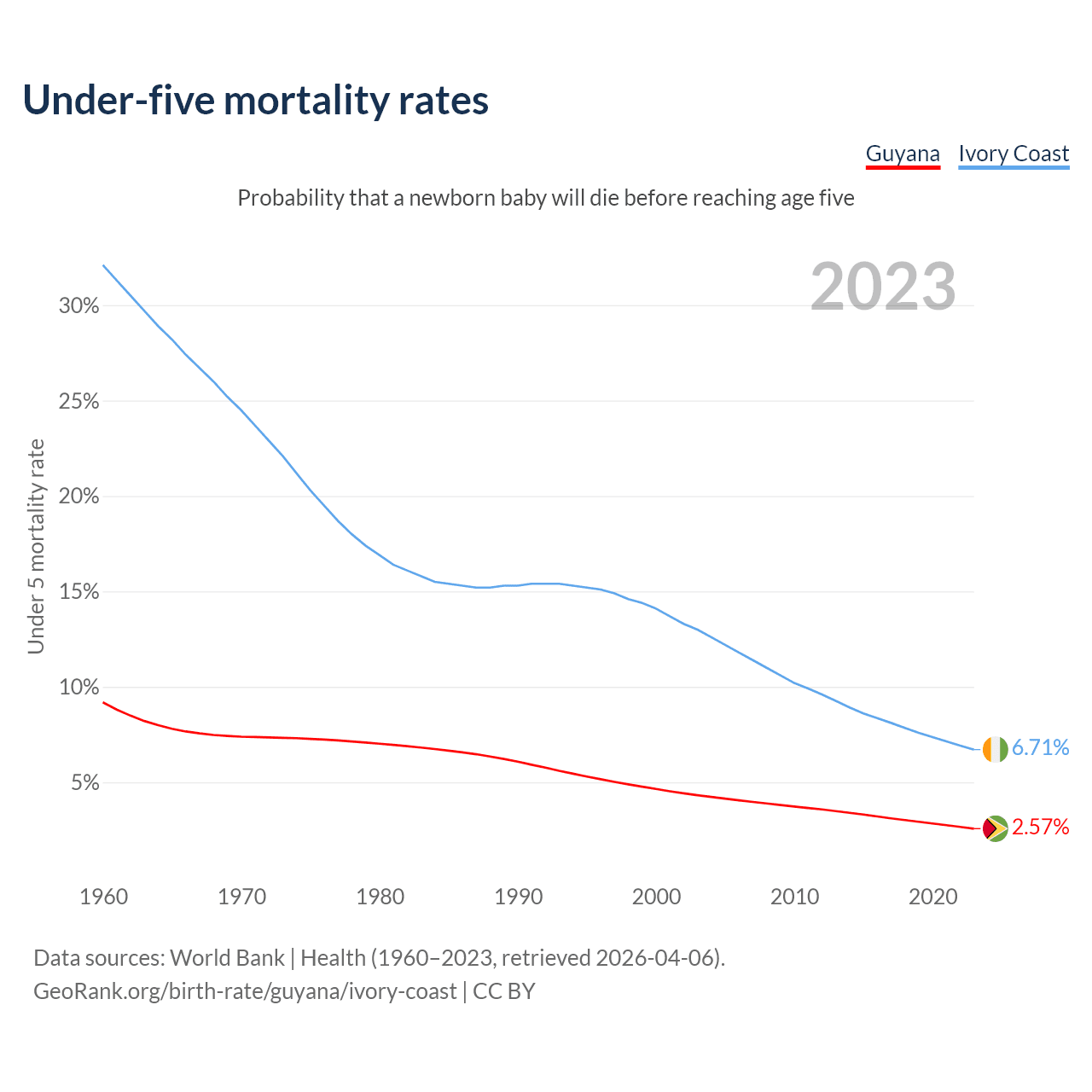 The chance that a newborn baby will die before reaching age five is 2.57% in Guyana and 6.71% in Ivory Coast. Above is a chart with historical data on under-five mortality rates.