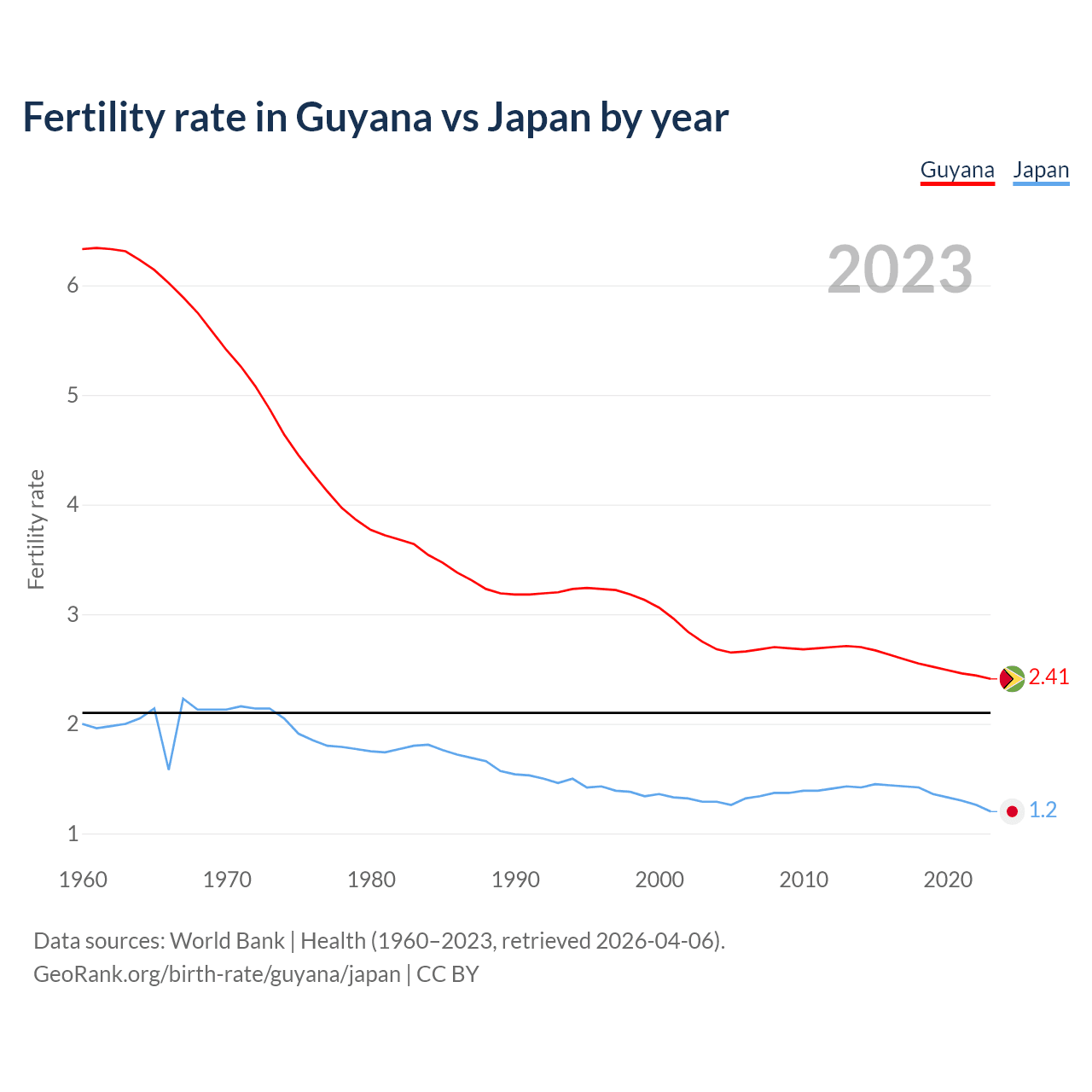 According to the latest available data on birth rates, the fertility rate in Guyana was 2.41 children per woman in 2023, compared to 1.2 in Japan in 2023. The replacement level is considered to be 2.1 children per woman.