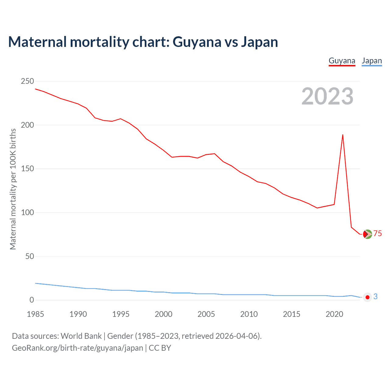 The maternal mortality rate, which is the probability of dying during childbirth or within 42 days of pregnancy termination, is 75 deaths per 100,000 live births in Guyana, compared to 3 deaths in Japan.