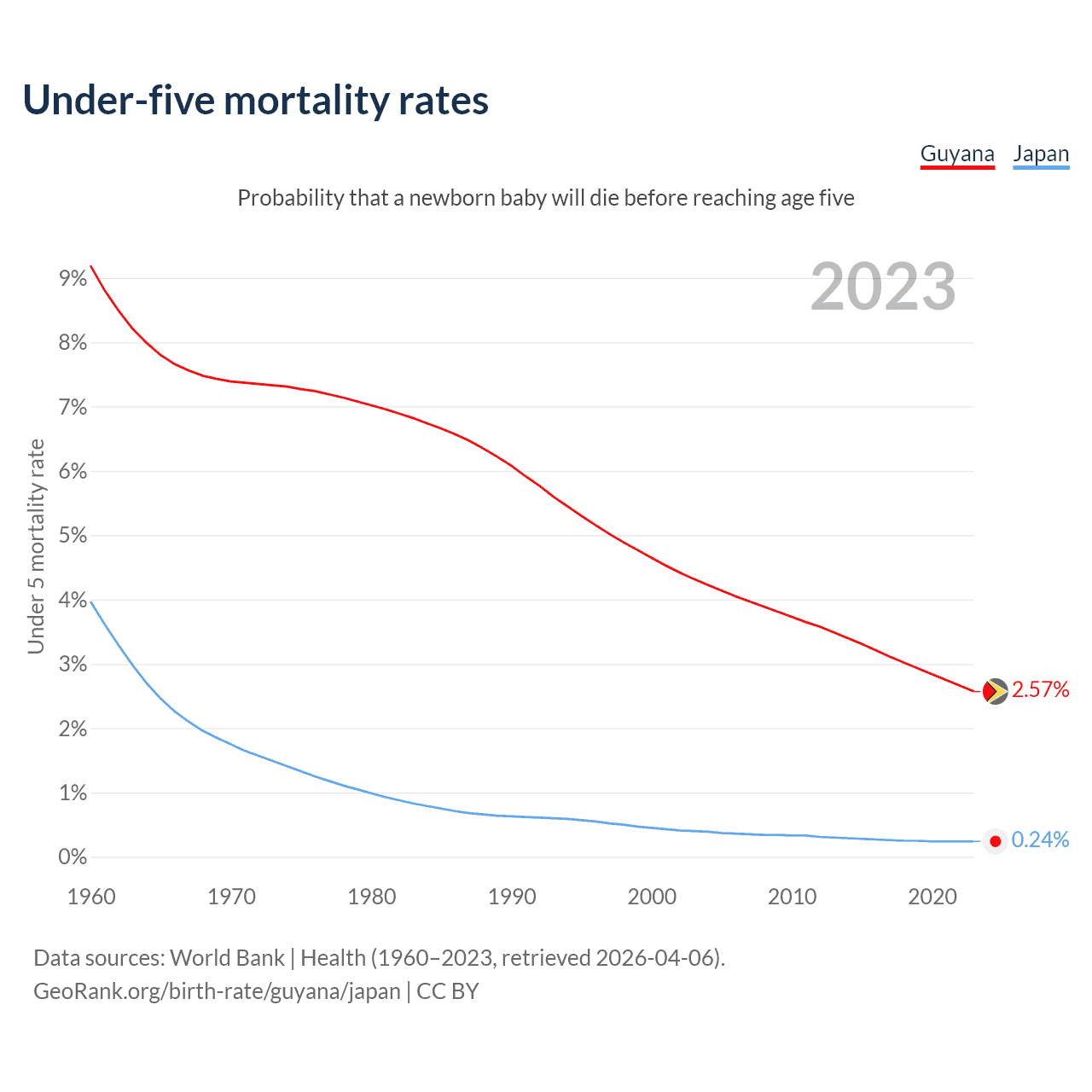 The chance that a newborn baby will die before reaching age five is 2.57% in Guyana and 0.24% in Japan. Above is a chart with historical data on under-five mortality rates.