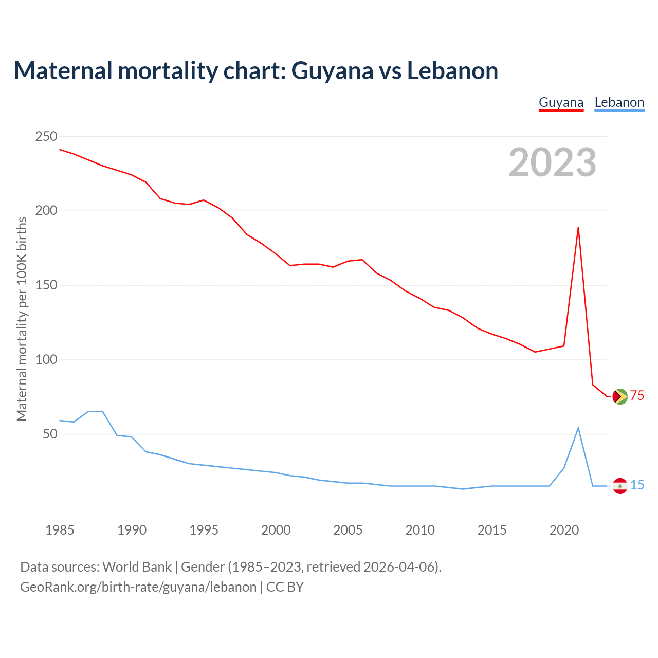 The maternal mortality rate, which is the probability of dying during childbirth or within 42 days of pregnancy termination, is 75 deaths per 100,000 live births in Guyana, compared to 15 deaths in Lebanon.