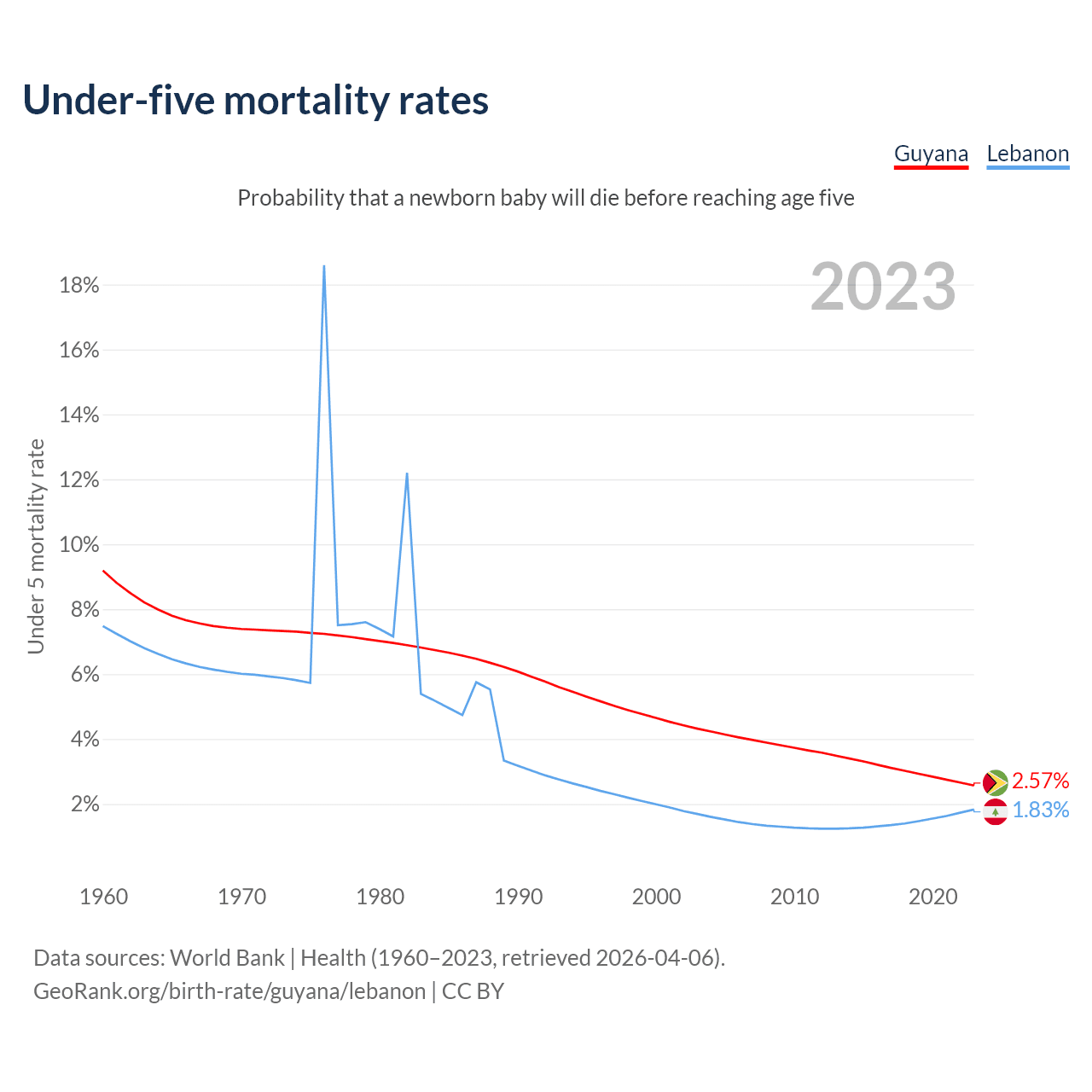 The chance that a newborn baby will die before reaching age five is 2.57% in Guyana and 1.83% in Lebanon. Above is a chart with historical data on under-five mortality rates.