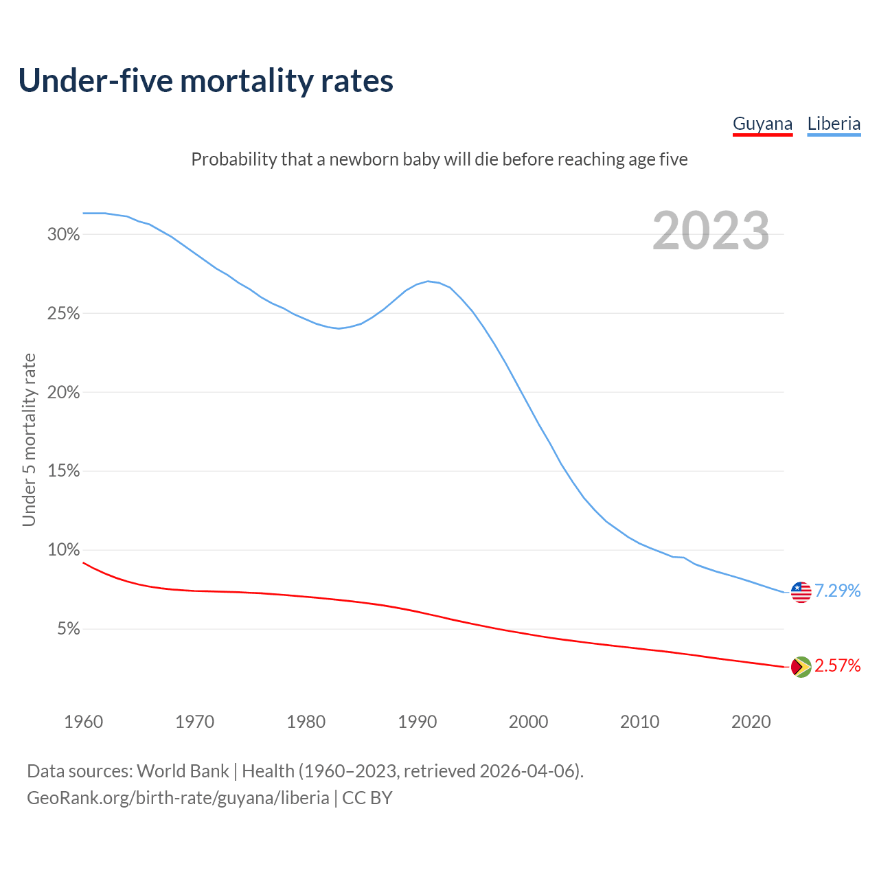 The chance that a newborn baby will die before reaching age five is 2.57% in Guyana and 7.29% in Liberia. Above is a chart with historical data on under-five mortality rates.