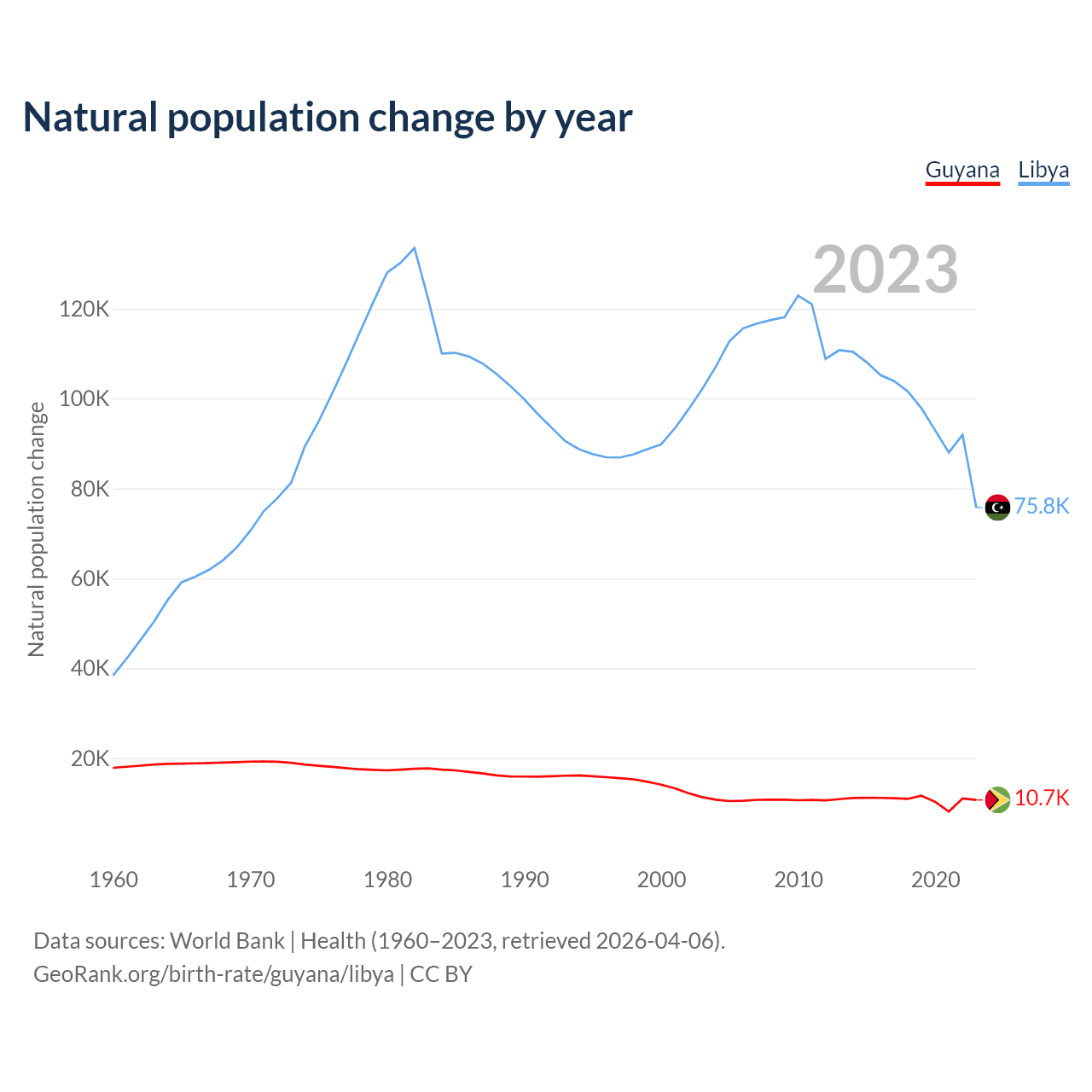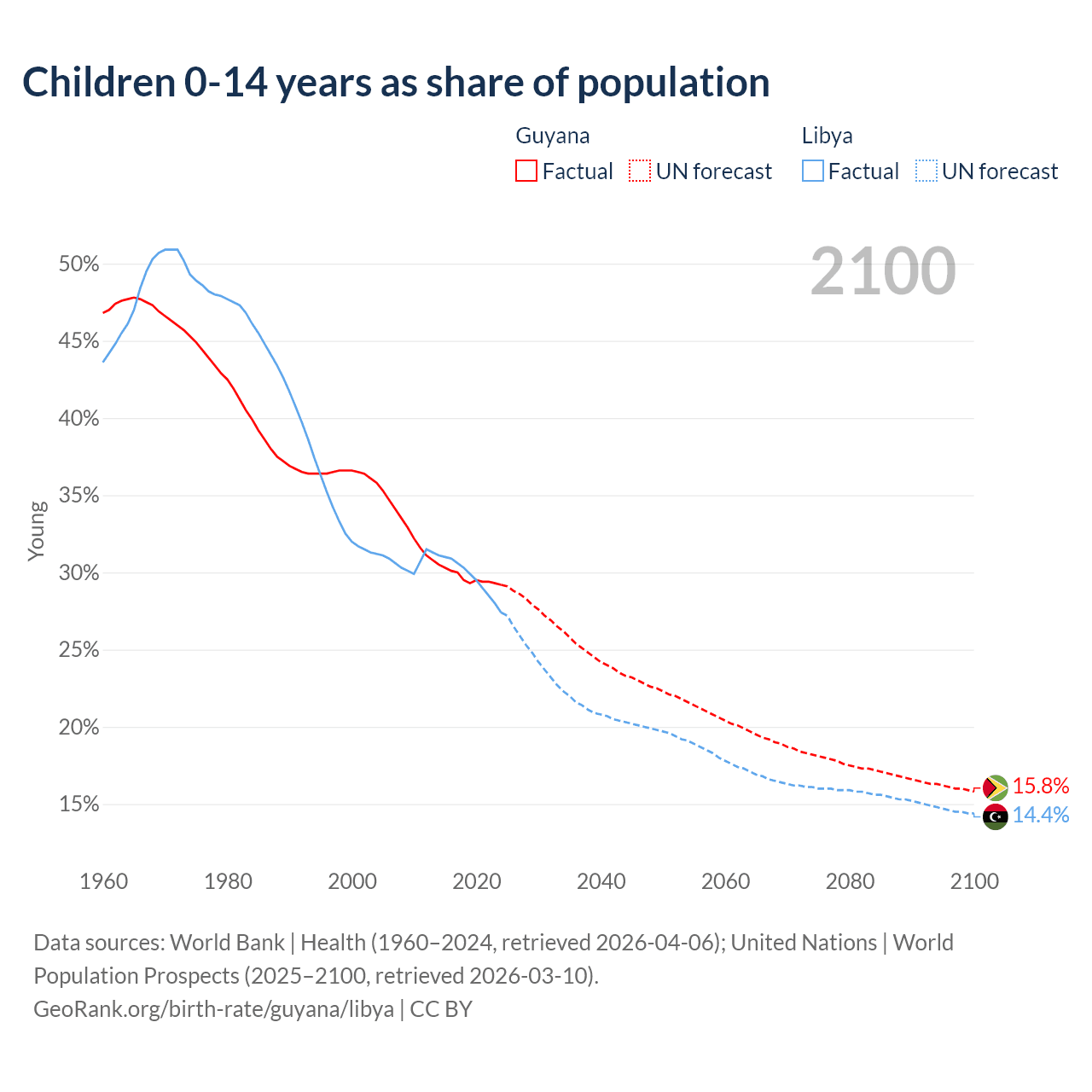 According to the latest available data on birth rates, the fertility rate in Guyana was 2.41 children per woman in 2023, compared to 2.36 in Libya in 2023. The replacement level is considered to be 2.1 children per woman.