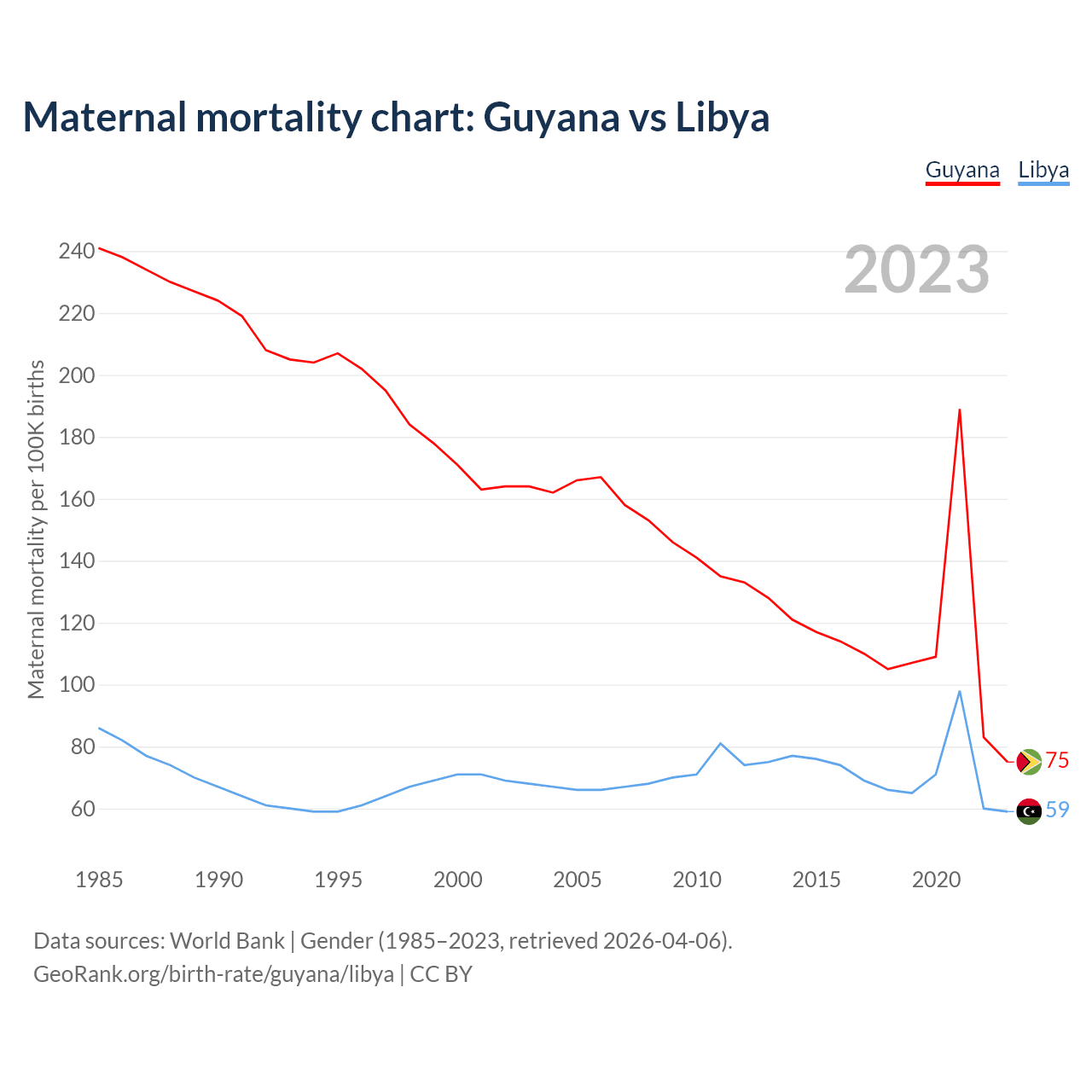 The maternal mortality rate, which is the probability of dying during childbirth or within 42 days of pregnancy termination, is 75 deaths per 100,000 live births in Guyana, compared to 59 deaths in Libya.