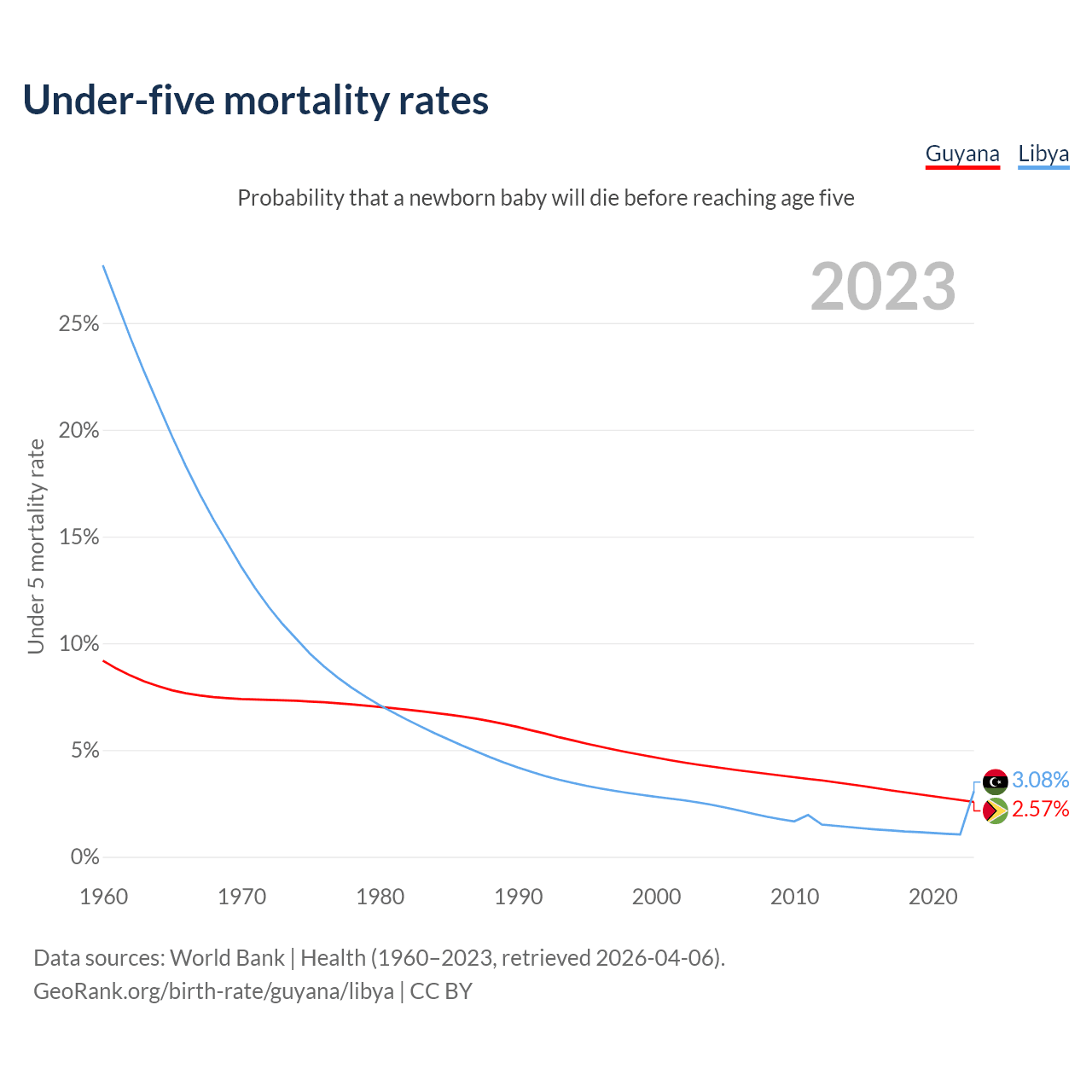 The chance that a newborn baby will die before reaching age five is 2.57% in Guyana and 3.08% in Libya. Above is a chart with historical data on under-five mortality rates.