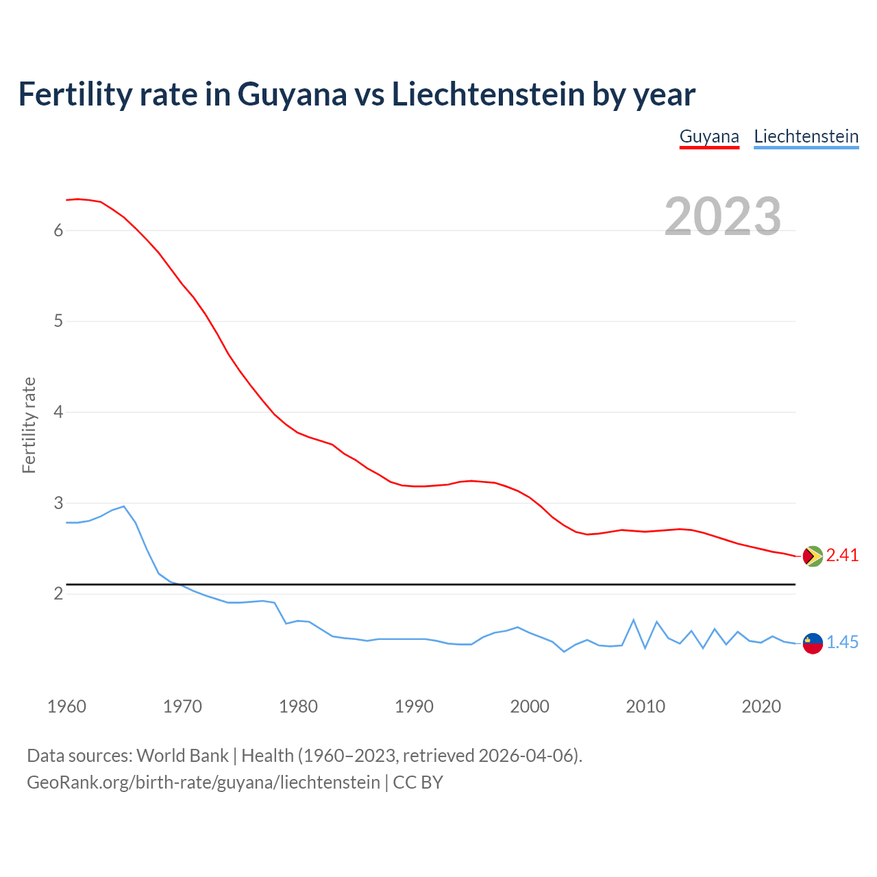 According to the latest available data on birth rates, the fertility rate in Guyana was 2.41 children per woman in 2023, compared to 1.45 in Liechtenstein in 2023. The replacement level is considered to be 2.1 children per woman.