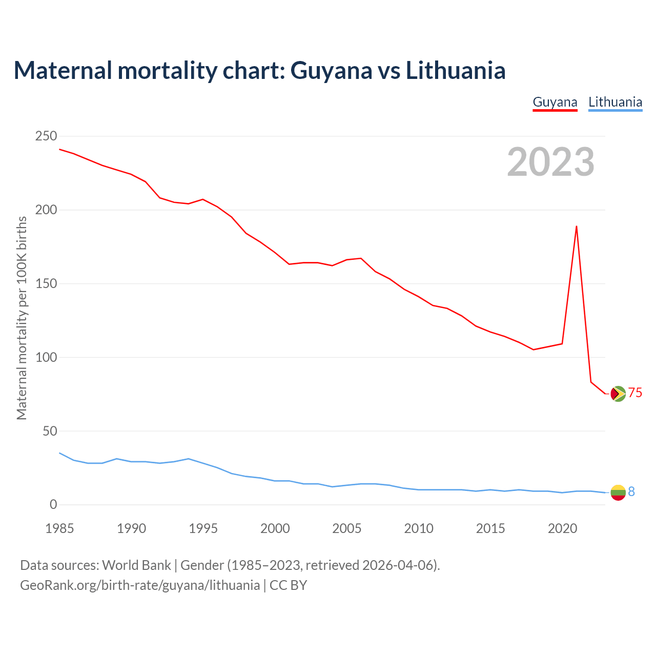 The maternal mortality rate, which is the probability of dying during childbirth or within 42 days of pregnancy termination, is 75 deaths per 100,000 live births in Guyana, compared to 8 deaths in Lithuania.