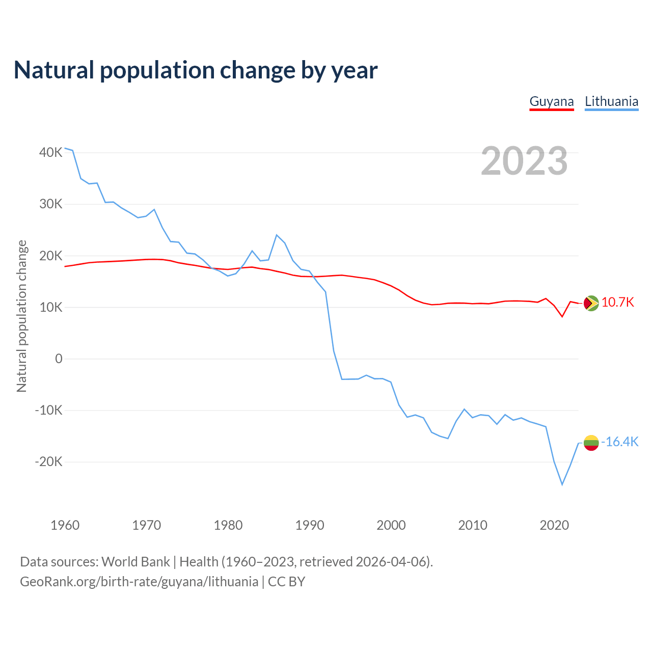 According to the latest available data on birth rates, the fertility rate in Guyana was 2.41 children per woman in 2023, compared to 1.18 in Lithuania in 2023. The replacement level is considered to be 2.1 children per woman.