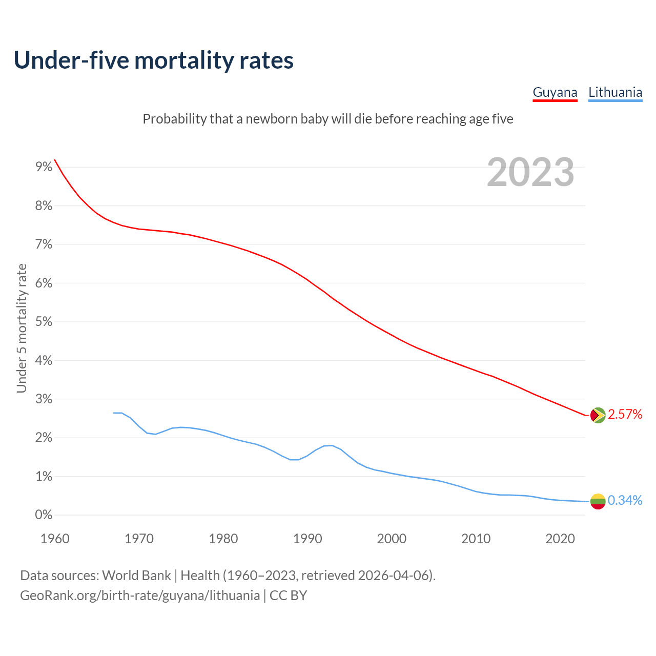 The chance that a newborn baby will die before reaching age five is 2.57% in Guyana and 0.34% in Lithuania. Above is a chart with historical data on under-five mortality rates.