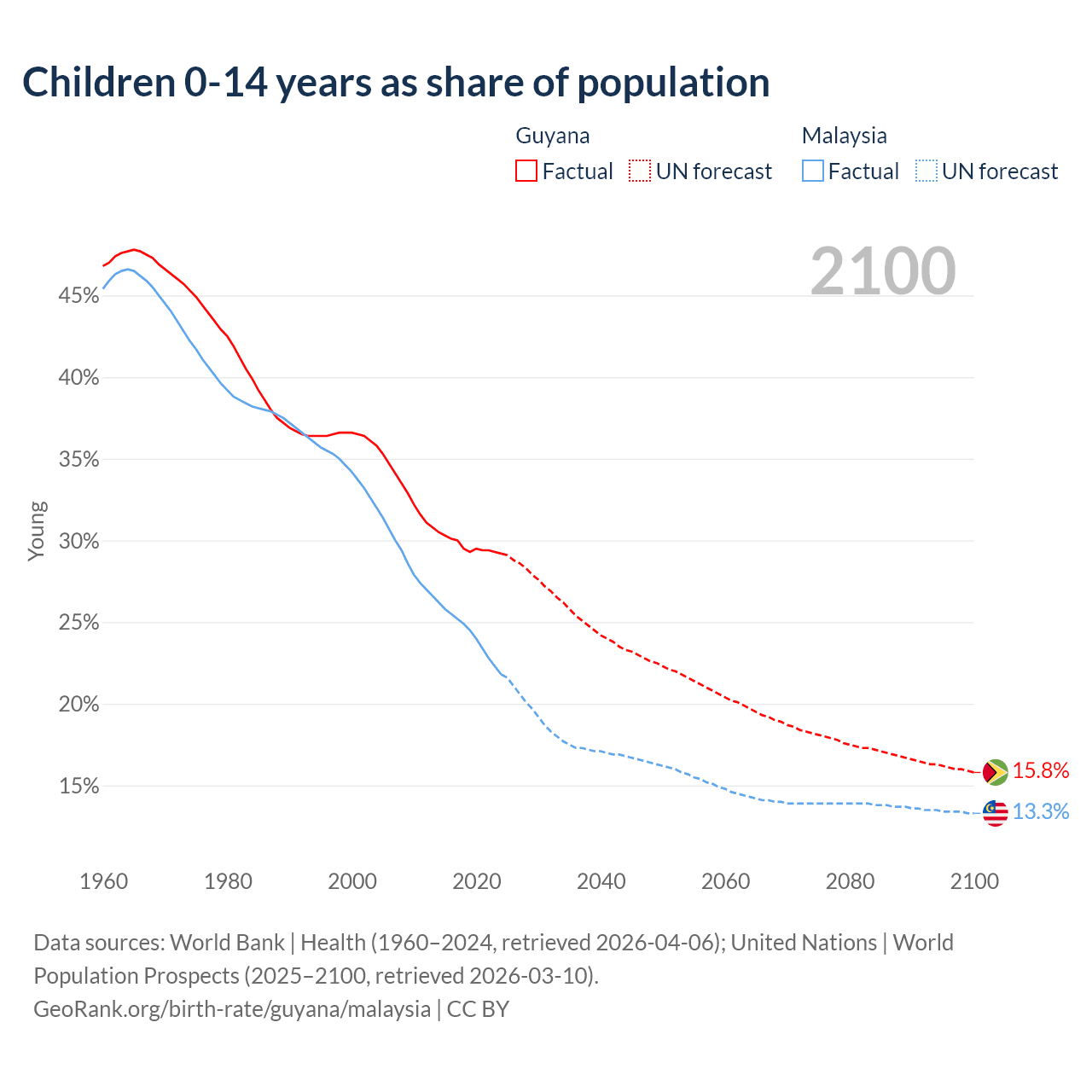 According to the latest available data on birth rates, the fertility rate in Guyana was 2.41 children per woman in 2023, compared to 1.55 in Malaysia in 2023. The replacement level is considered to be 2.1 children per woman.
