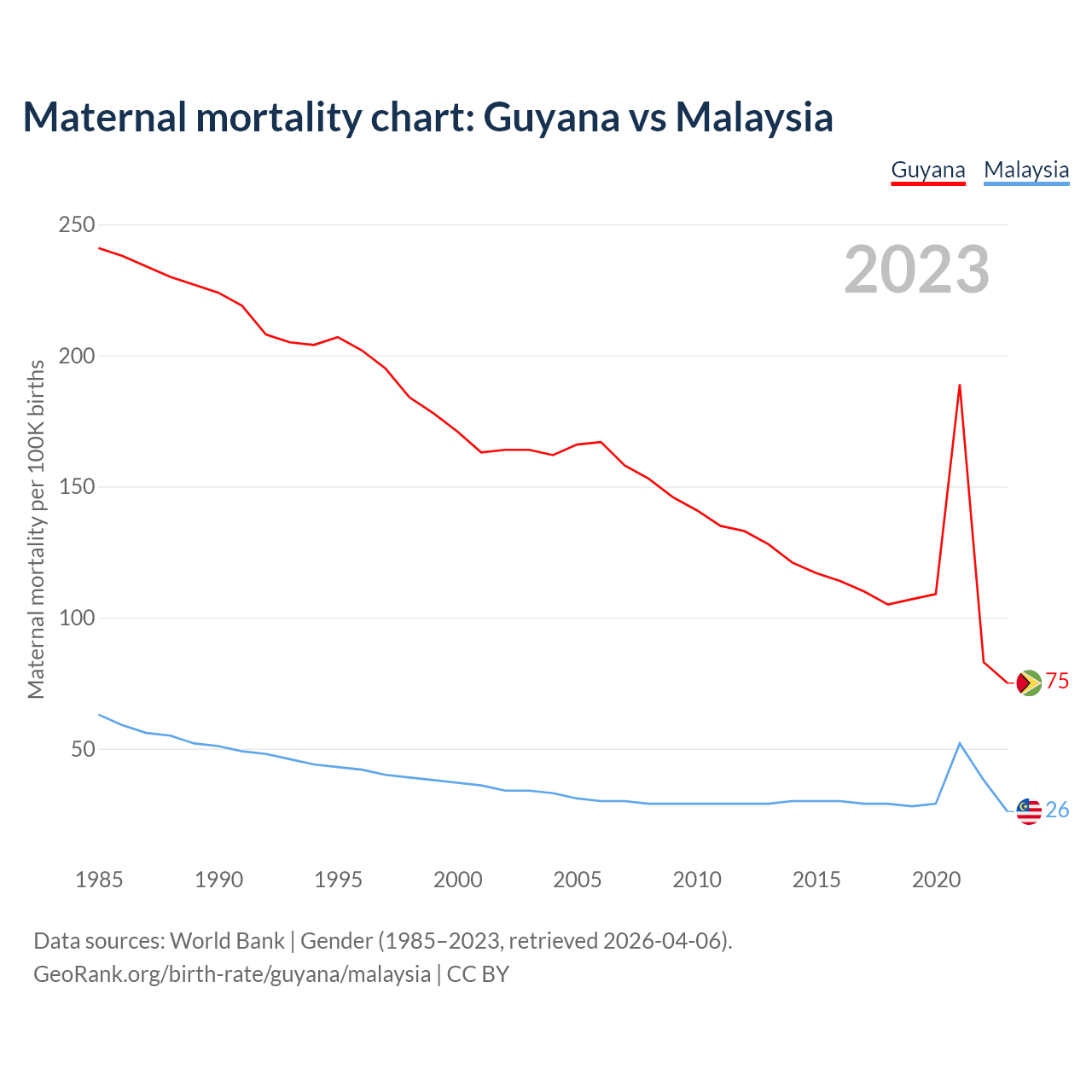 The maternal mortality rate, which is the probability of dying during childbirth or within 42 days of pregnancy termination, is 75 deaths per 100,000 live births in Guyana, compared to 26 deaths in Malaysia.