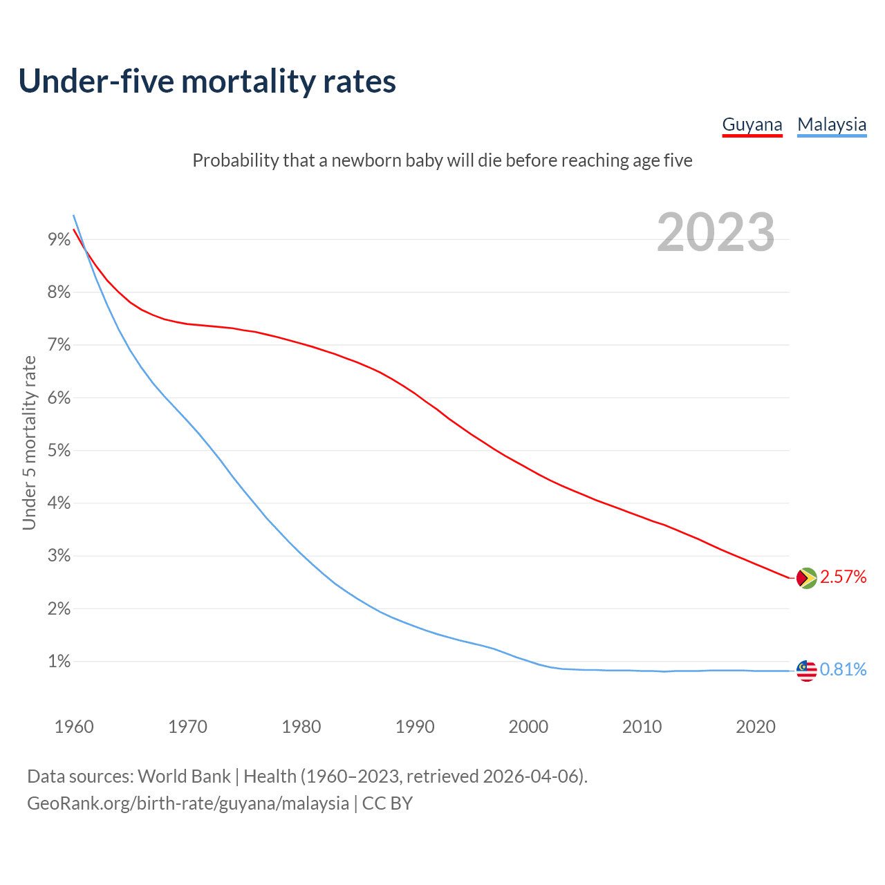 The chance that a newborn baby will die before reaching age five is 2.57% in Guyana and 0.81% in Malaysia. Above is a chart with historical data on under-five mortality rates.