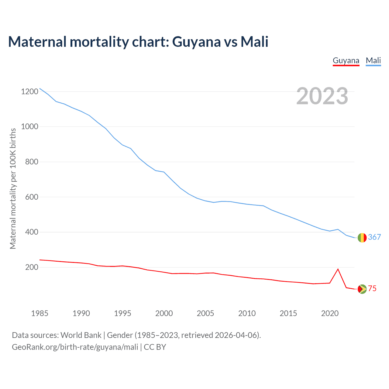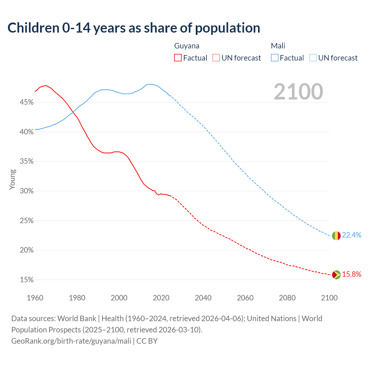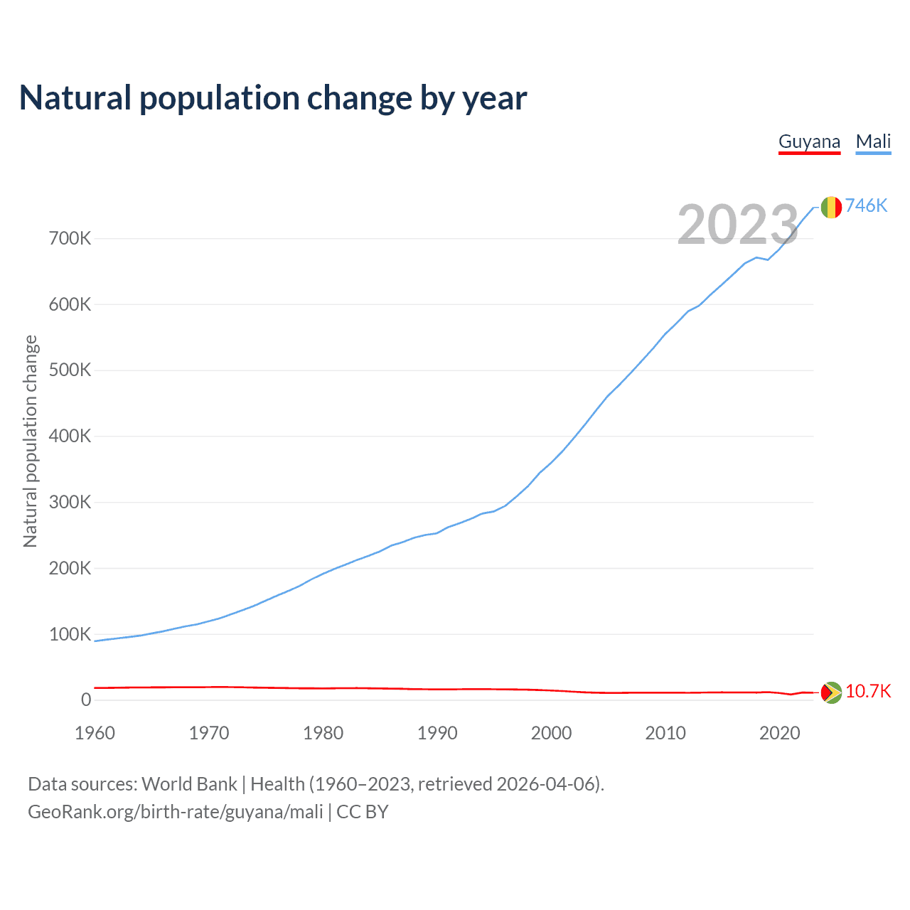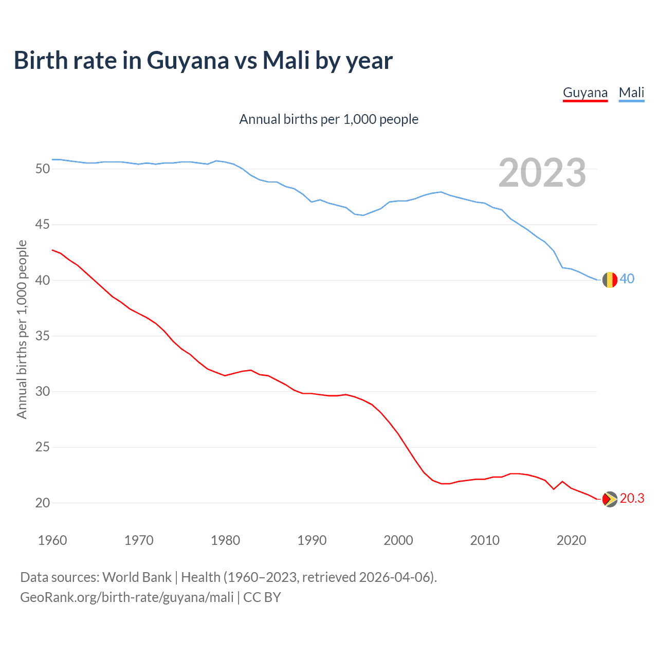 Guyana has an annual birth rate of 20.3 births per 1,000 people, compared to 40 for Mali. The average number of children a woman is expected to have during her lifetime — the fertility rate, is 2.41 in Guyana and 5.61 in Mali — 132.8% difference.