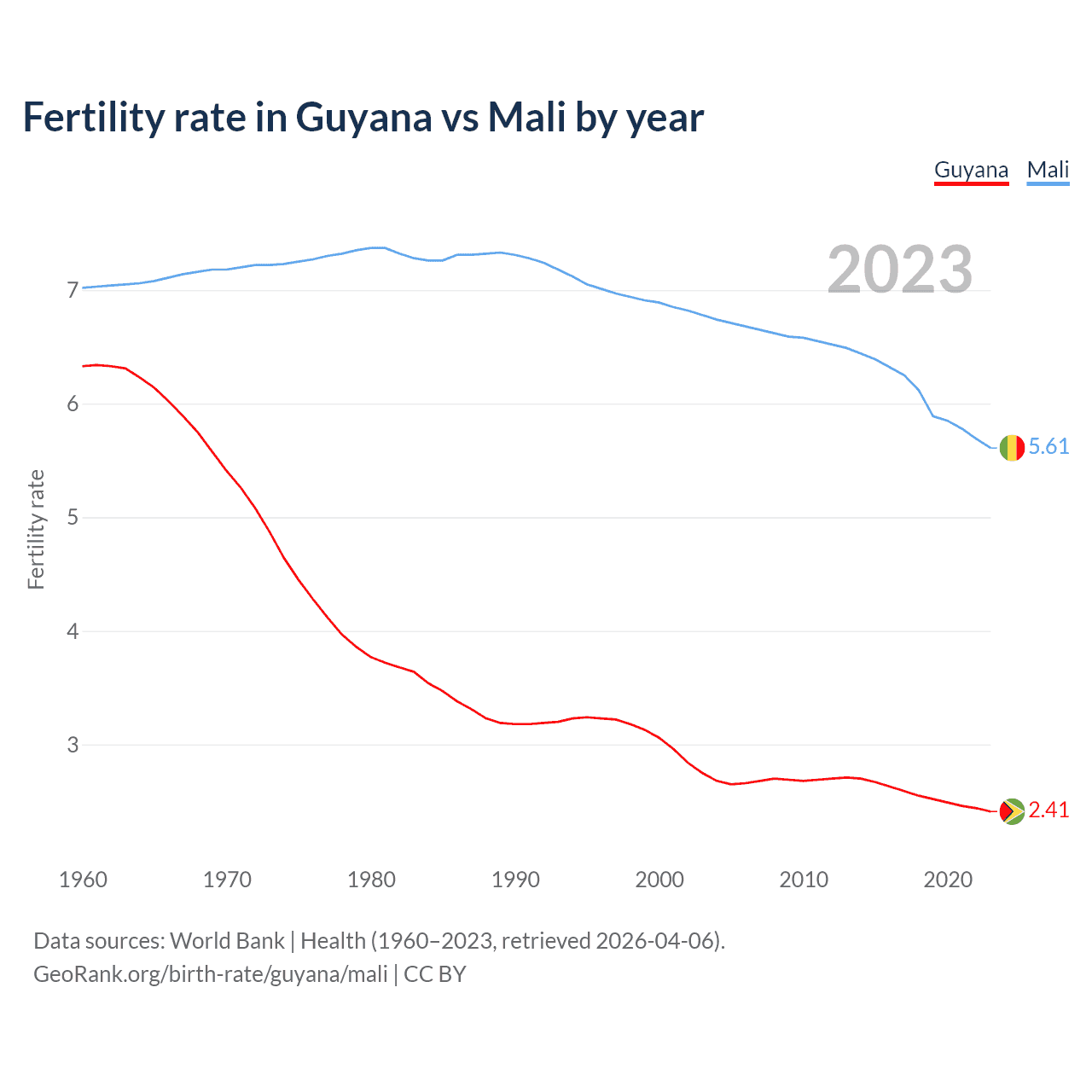 1960 vs 2023, the fertility rate has decreased by 61.9% in Guyana and by 20% in Mali — in 1960, it was 6.33 and 7.02, respectively.
