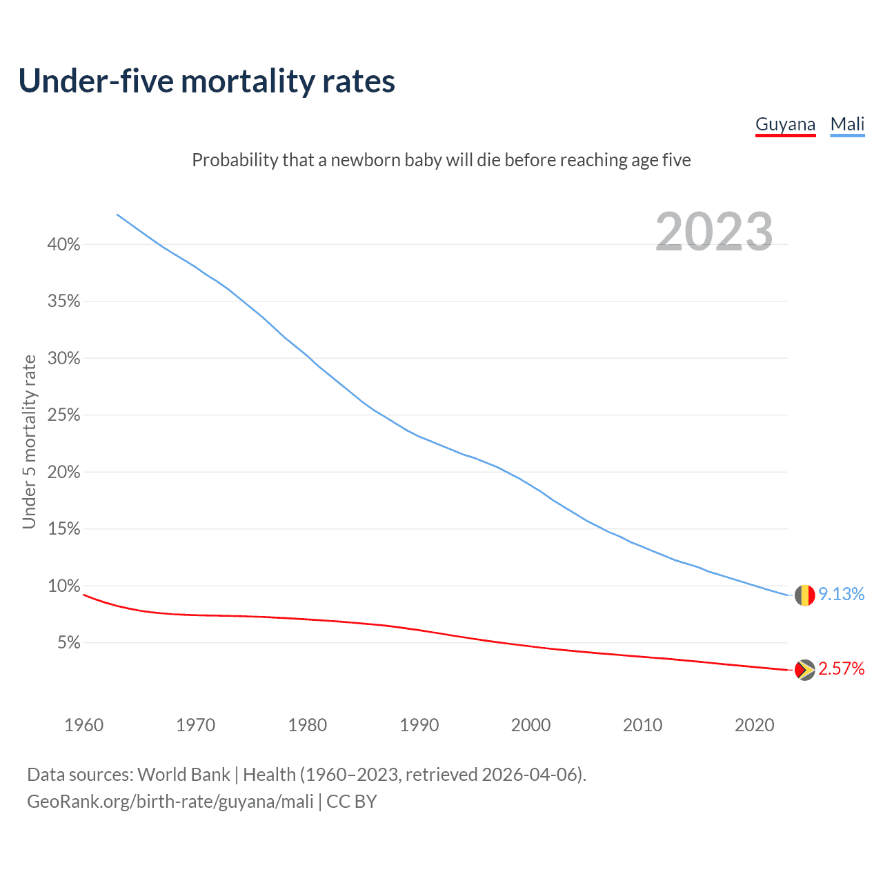 The chance that a newborn baby will die before reaching age five is 2.57% in Guyana and 9.13% in Mali. Above is a chart with historical data on under-five mortality rates.