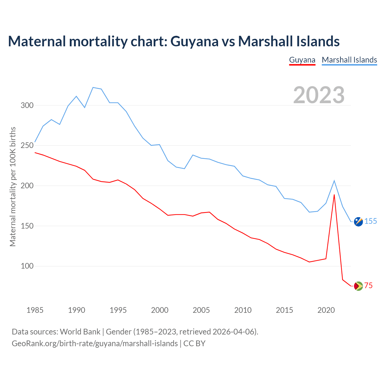 The maternal mortality rate, which is the probability of dying during childbirth or within 42 days of pregnancy termination, is 75 deaths per 100,000 live births in Guyana, compared to 155 deaths in the Marshall Islands.