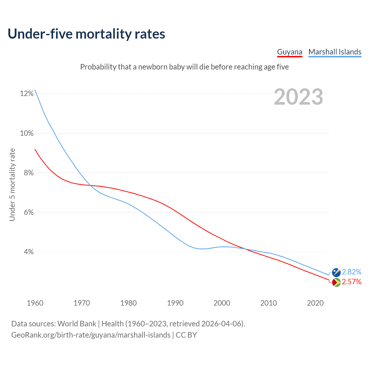 The chance that a newborn baby will die before reaching age five is 2.57% in Guyana and 2.82% in the Marshall Islands. Above is a chart with historical data on under-five mortality rates.