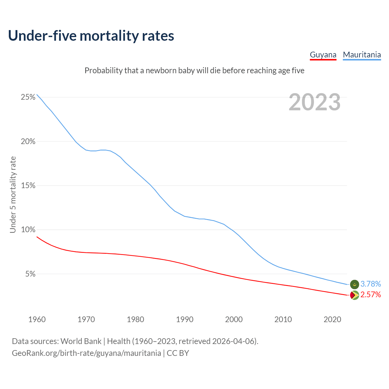 The chance that a newborn baby will die before reaching age five is 2.57% in Guyana and 3.78% in Mauritania. Above is a chart with historical data on under-five mortality rates.
