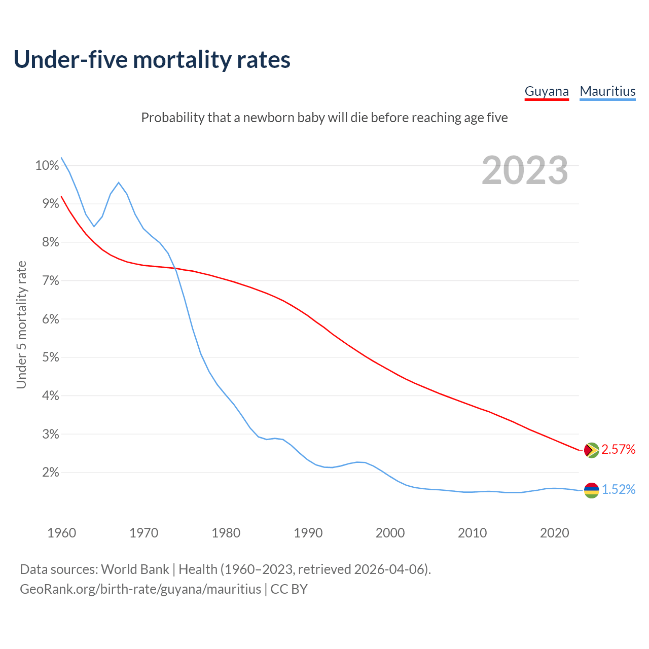 The chance that a newborn baby will die before reaching age five is 2.57% in Guyana and 1.52% in Mauritius. Above is a chart with historical data on under-five mortality rates.