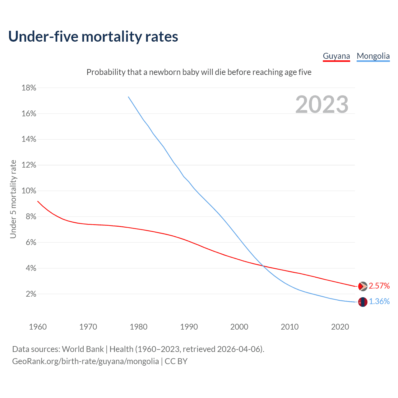 The chance that a newborn baby will die before reaching age five is 2.57% in Guyana and 1.36% in Mongolia. Above is a chart with historical data on under-five mortality rates.