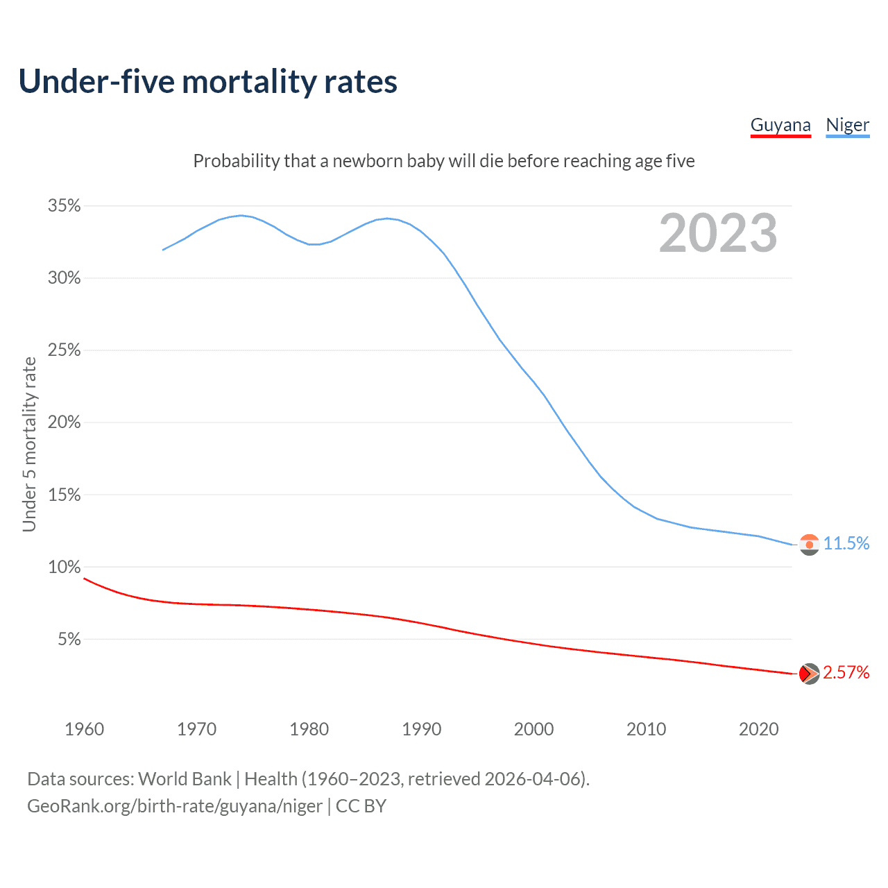 The chance that a newborn baby will die before reaching age five is 2.57% in Guyana and 11.5% in Niger. Above is a chart with historical data on under-five mortality rates.