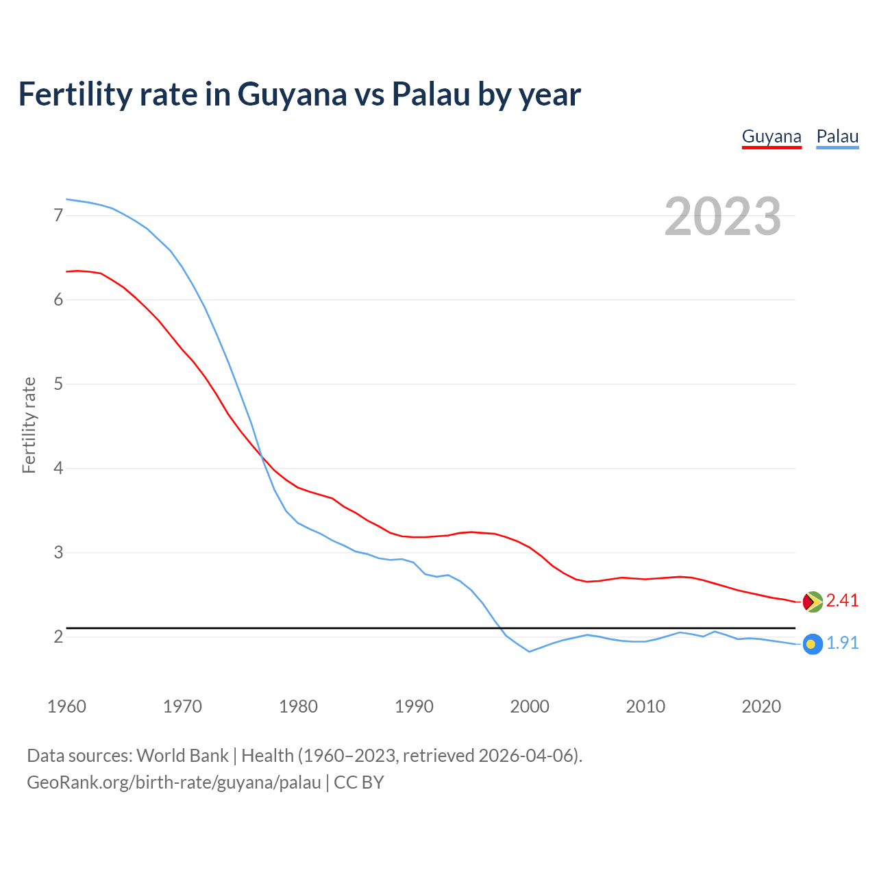 According to the latest available data on birth rates, the fertility rate in Guyana was 2.41 children per woman in 2023, compared to 1.91 in Palau in 2023. The replacement level is considered to be 2.1 children per woman.