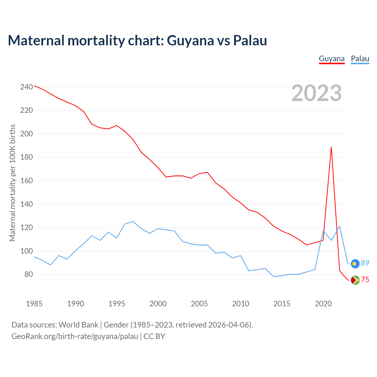 The maternal mortality rate, which is the probability of dying during childbirth or within 42 days of pregnancy termination, is 75 deaths per 100,000 live births in Guyana, compared to 89 deaths in Palau.