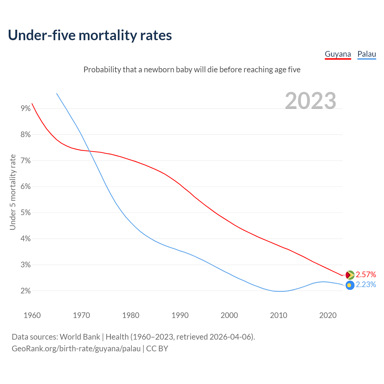 The chance that a newborn baby will die before reaching age five is 2.57% in Guyana and 2.23% in Palau. Above is a chart with historical data on under-five mortality rates.