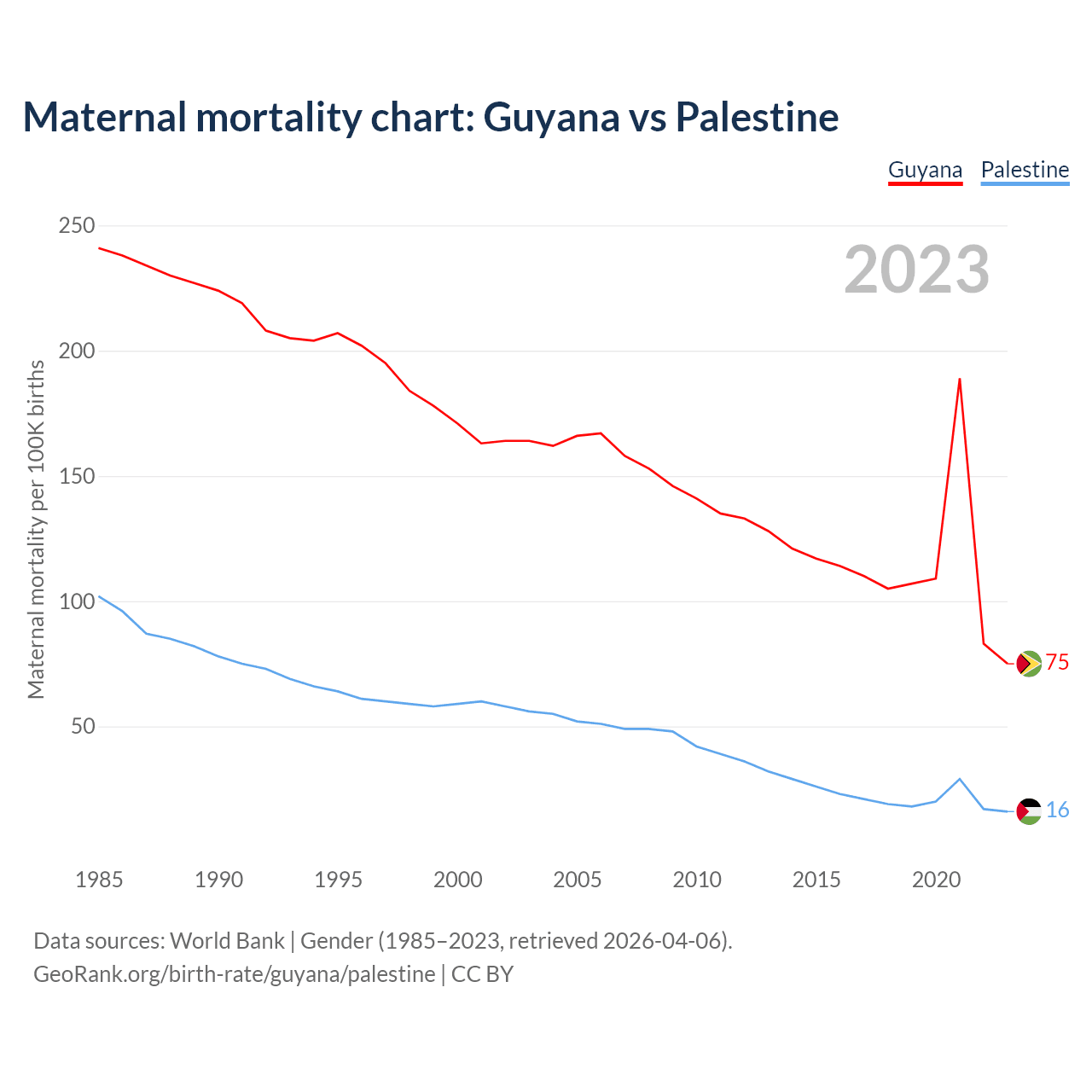 The maternal mortality rate, which is the probability of dying during childbirth or within 42 days of pregnancy termination, is 75 deaths per 100,000 live births in Guyana, compared to 16 deaths in Palestine.