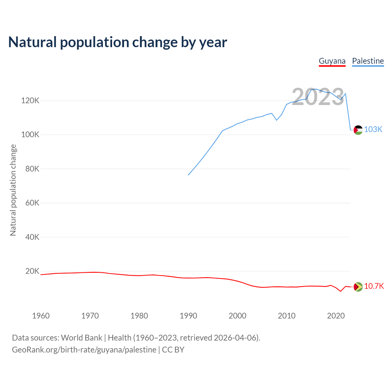 According to the latest available data on birth rates, the fertility rate in Guyana was 2.41 children per woman in 2023, compared to 3.31 in Palestine in 2023. The replacement level is considered to be 2.1 children per woman.