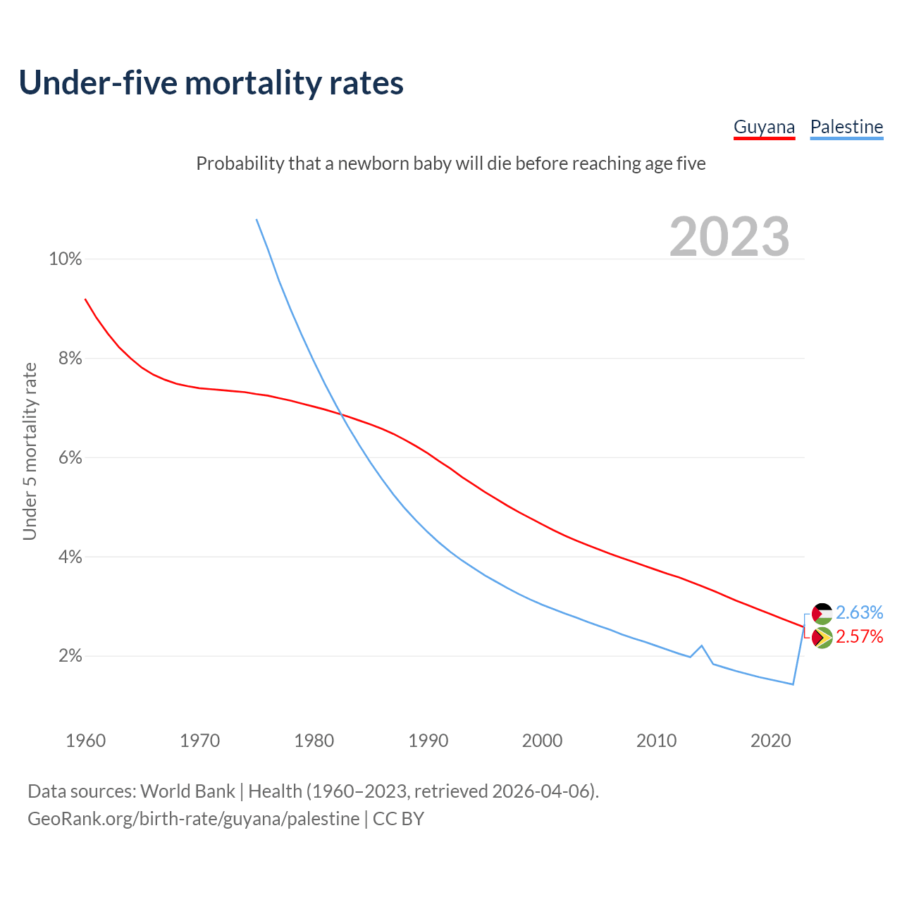 The chance that a newborn baby will die before reaching age five is 2.57% in Guyana and 2.63% in Palestine. Above is a chart with historical data on under-five mortality rates.