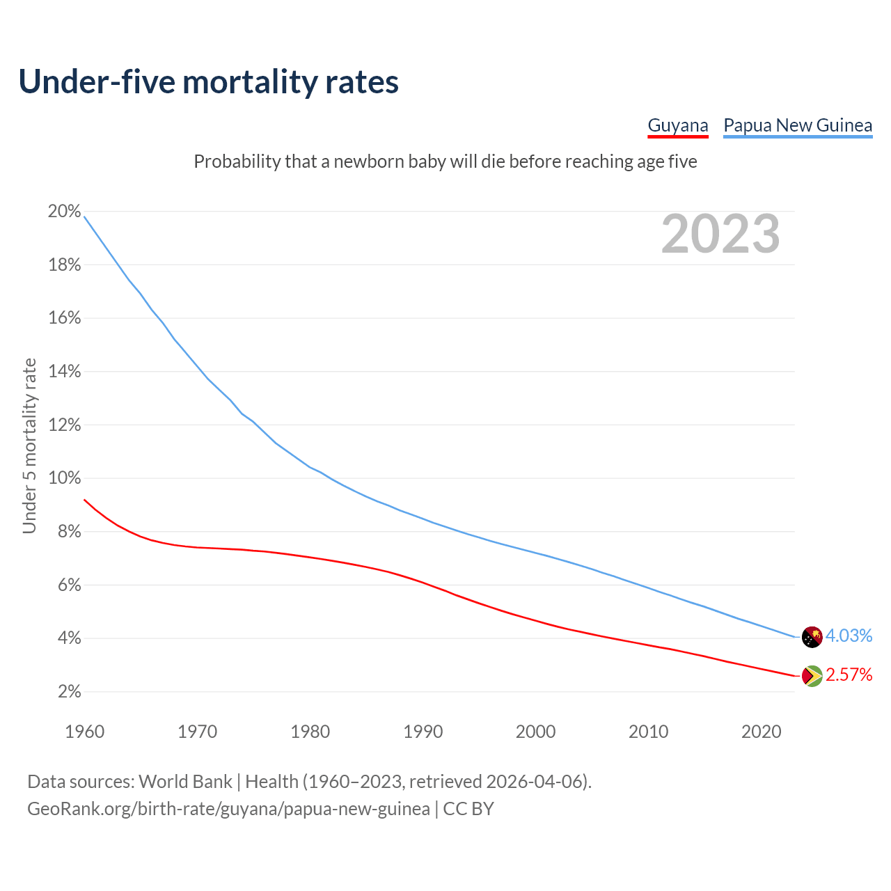 The chance that a newborn baby will die before reaching age five is 2.57% in Guyana and 4.03% in Papua New Guinea. Above is a chart with historical data on under-five mortality rates.