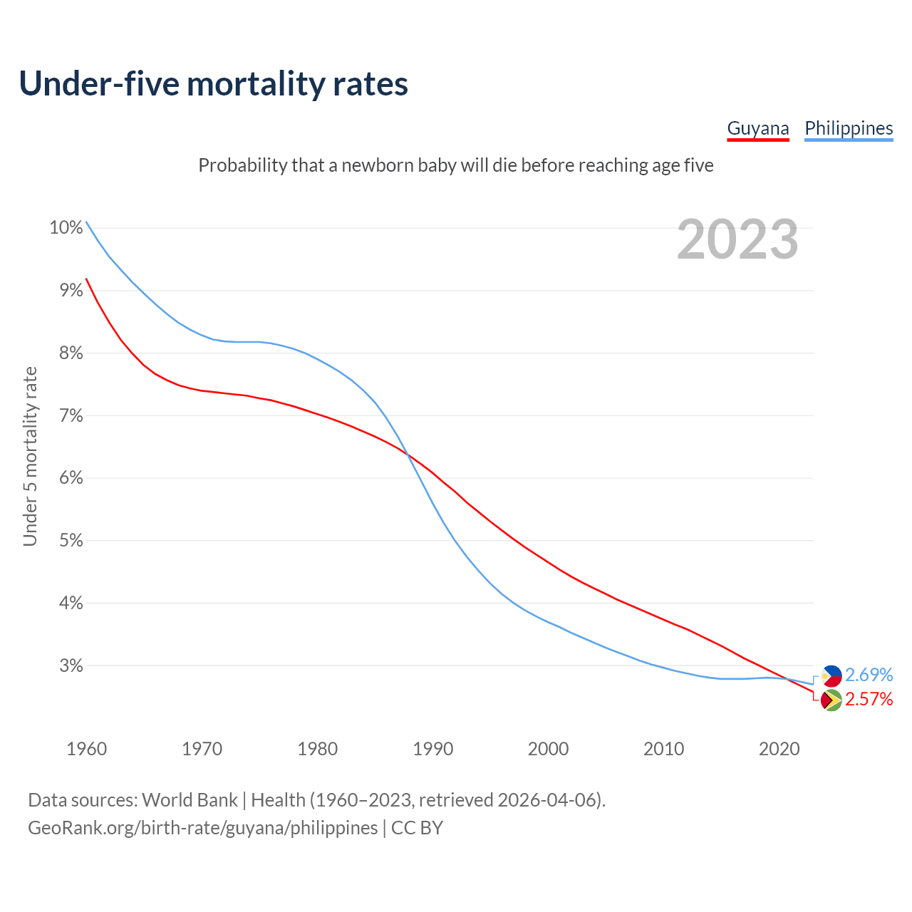 The chance that a newborn baby will die before reaching age five is 2.57% in Guyana and 2.69% in the Philippines. Above is a chart with historical data on under-five mortality rates.