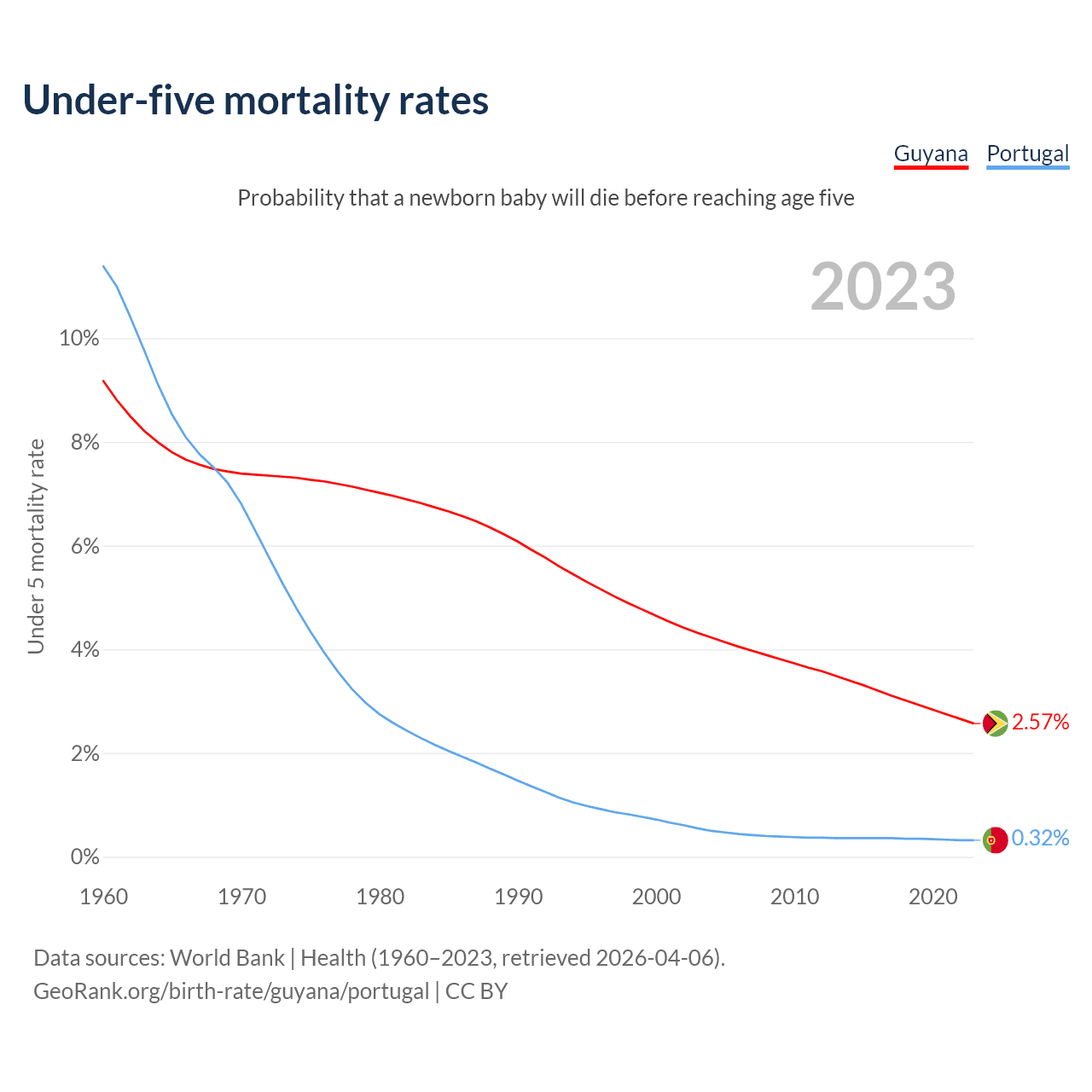 The chance that a newborn baby will die before reaching age five is 2.57% in Guyana and 0.32% in Portugal. Above is a chart with historical data on under-five mortality rates.