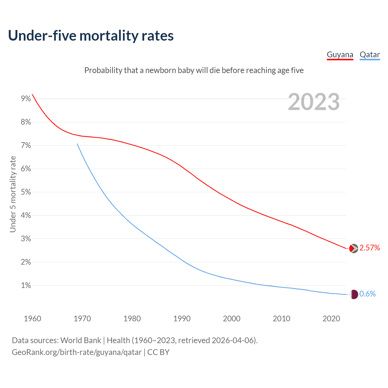 The chance that a newborn baby will die before reaching age five is 2.57% in Guyana and 0.6% in Qatar. Above is a chart with historical data on under-five mortality rates.