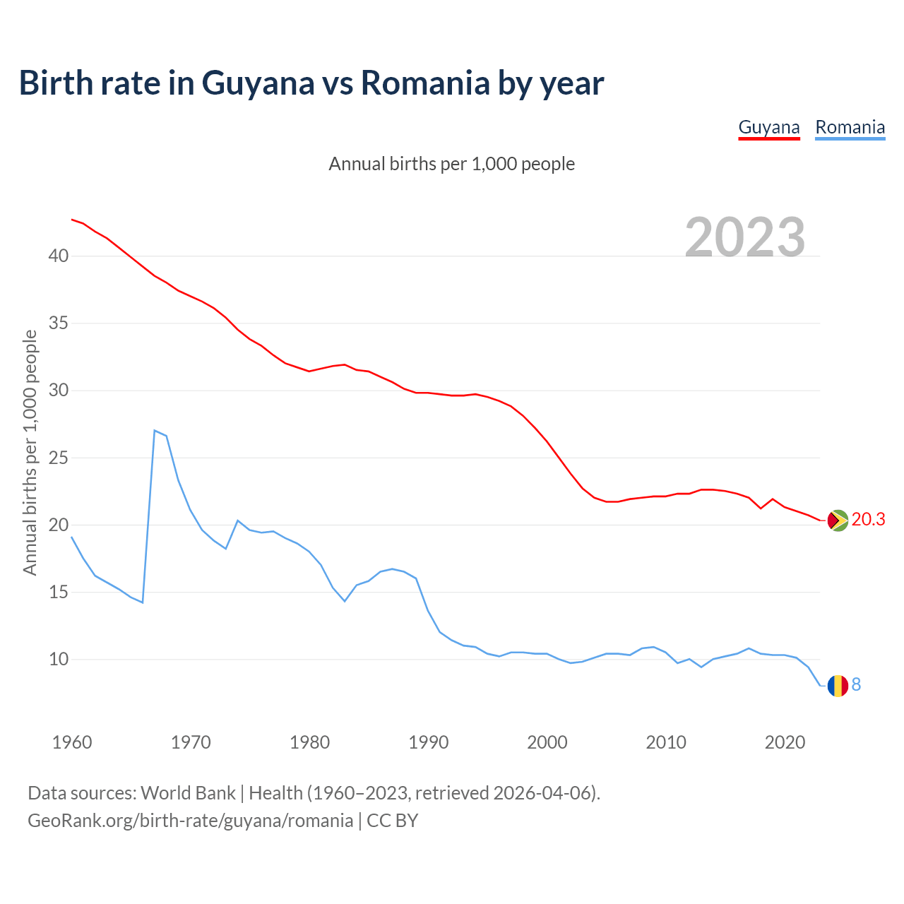 According to the latest available data on birth rates, the fertility rate in Guyana was 2.41 children per woman in 2023, compared to 1.71 in Romania in 2023. The replacement level is considered to be 2.1 children per woman.